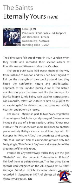 Подробнее Ломовой первый альбом был с восторгом встречен панками, однако несмотря на то, что он на порядок превосходил большинство из панк-пластинок 77-ого года, достойной хит-парадной судьбы он не встретил. Единственный сингл, удосужившийся покрасоваться в Тор-40 — ‘This Perfect Day’, включенный во второй альбом ‘Eternally Yours’. Последний был записан с новым басистом Algy Ward, ибо предшественник ушел играть в Lurkers Saints категорически отказывались следовать традиционным панк-канонам, как в имидже, так и в музыке ‘Eternally Yours’ помимо забойных панк-песен содержал баллады, тяжелые ритм-энд-блюзовые трэки напоминающие ранних Rolling Stones и Stooges. Альбом заслуженно наречен «панк-классикой» и по мнению многих благодаря ему Saints могут считаться лучшей панк-группой поколения 77, но широкие массы встретили нововведения в штыки и группа стала переходить в разряд культовой — то есть боготворимой единицами и игнорируемой большинством. Начиная с третьего диска ‘Prehistoric Sounds’ Saints полностью распрощались с панк-роком, войдя в область ритм-энд-блюзовых музыкальных экспериментов. В конце 1978 года группа распалась — Kuepper сформировал банду Laughing Clowns, Ward присоединился к Damned. Но в 1980 году Chris Bailey реформировал Saints с гитаристом Chris Barrington, Jaine Hall на бас-гитаре и Mark Birmingham за ударными. После краткосрочного второго распада в 1984 году был взят новый басист Tracy Pew из Birthday Party, но в ноябре 1986 года он скончался от рака, после чего группа пришла в следующий вид — Bailey, Hay Richard Burgmann (бас-гитара) и Arturo LaRizza (ударные). Saints продолжали искать новое в музыке и зачастую его находили, хотя адекватной благодарности от массового слушателя ждать не приходилось Тем не менее имя Saints уже было вписано в историю панка — первовеличинная звезда Bob Geldof сказал однажды: «было три группы, которые в семидесятые годы изменили всю рок-музыку — это Sex Pistols, Ramones и Saints!» Третий распад Saints произошел в 1987 году, два года спустя Bailey собрал команду заново (Arturo, lam Sheddon, Barrington Francis и Joe Chiofalo) на три года, после чего Saints прекратили свое существование вплоть до 1994 года, когда нетомимый Bailey снова принялся за старое. Помимо этого Bailey отметился тем, что выступал с сольными акустическими концертами Kuepper, недовольный чрезмерным эксплуатацией своим бывшим соратником названия Saints, создал альтернативный проект Aints.