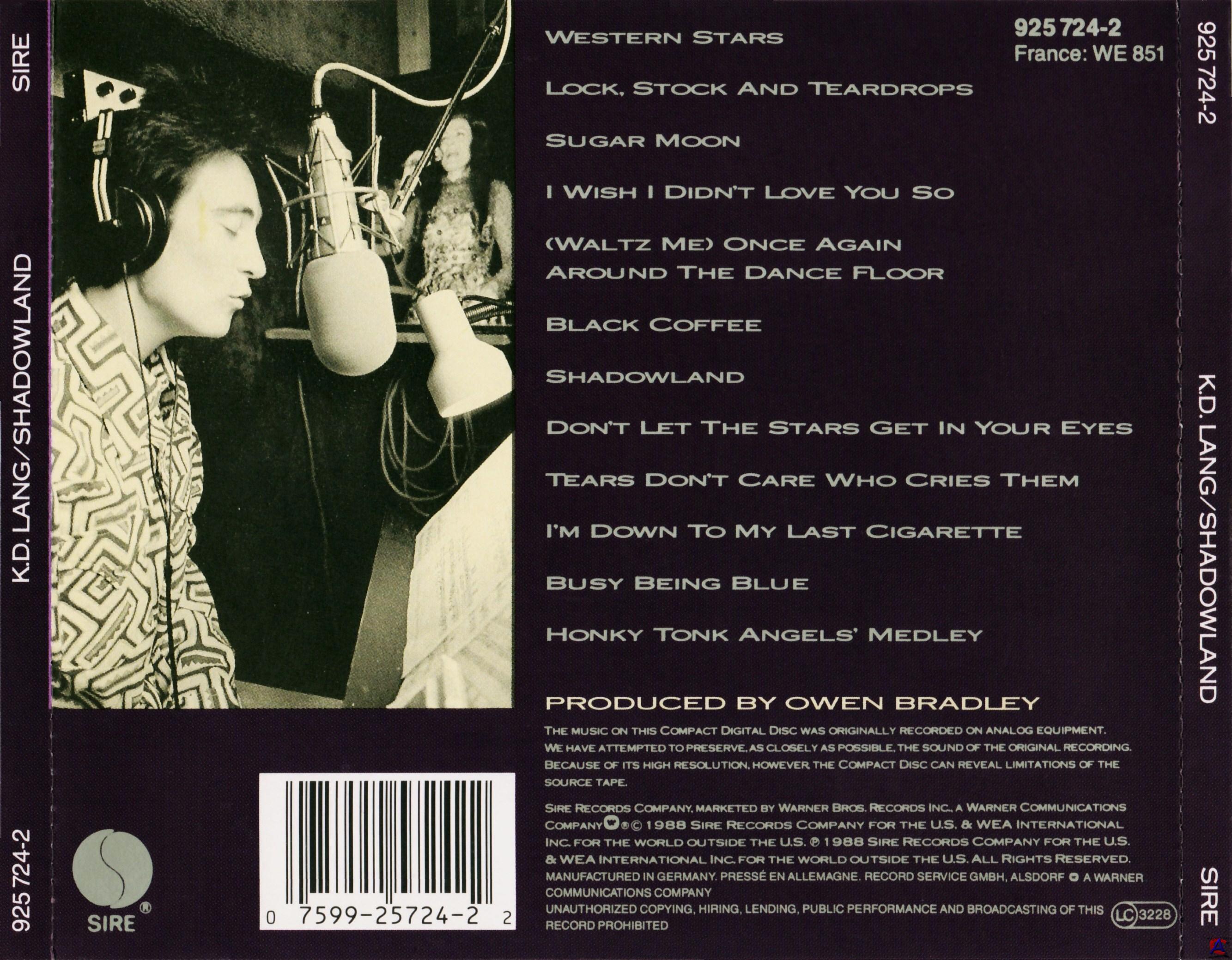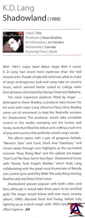 Подробнее Певица k.d.lang родилась 2 ноября 1961 года в городе Эдмонтон, столице канадской провинции Альберта. Её родителей зовут Одри и Адам Фредерик Лэнг. Среди её предков были англичане, ирландцы, шотландцы, немцы, исландцы, русские, евреи и сиу. Когда Кэтрин было девять месяцев, семья переехала в маленький городок Консорт (провинция Альберта), где росла вместе с двумя сёстрами и братом среди канадских прерий. Отец был хозяином аптекарского магазина, он ушёл из семьи, когда Кэтрин было двенадцать лет. В детстве училась играть на фортепиано и на гитаре. Будучи школьницей, благодаря своему росту, 173 см, состояла в национальной сборной по метанию дротиков. Она и сегодня увлекается спортом: велосипед, йога и любимый, сделанный по заказу Harley Davidson Springer. Родители сыграли важную роль в становлении k.d.lang как музыканта: «Моя мама чрезвычайно благосклонно относилась к моим музыкальным наклонностям. Каждую неделю она отправляла нас с сестрой за 60 миль от дома, на уроки музыки, в женский монастырь. Монахиня, которая давала мне уроки фортепьяно, имела привычку бить меня линейкой по пальцам…» Вслед за пианино у k.d.lang проснулся интерес и к пению. Подарок родителей на Рождество — электрогитара, дал толчок к развитию того стиля, который по сей день отличает k.d. от других исполнителей. В 14 она сочинила первую песню «Hoping My Dreams Come True», которую незамедлительно выслала певице Э. Мюррей со словами: «Можете пользоваться моим текстом», но ответа, разумеется, не получила. После окончания школы Кэтрин поступила в Red Deer College. В колледже она открыла для себя кантри, ее кумиром стала печально известная звезда этого стиля Пэтси Клайн, трагически погибшая в авиакатастрофе в возрасте 31 года. В память о ней Кэтрин назвала свою группу, «Reclines», которую основала в 1983 году. Дебютный альбом назывался «Friday Dance Promenade». Ее выразительное и эмоционально-насыщенное пение быстро приносит ей известность на родине. О ней стали писать газеты, что привлекло внимание крупных лейблов звукозаписи. B 1984 году она подписывает контракт со звукозаписывающей компанией «Seri Records», а спустя год, в 1985, знакомится с гитаристом и композитором Беном Минком. Их первая совместно написанная песня «High Time for a Detour» вошла в альбом «Angel With a Lariat». Лэнг получает первую награду Juno Awards. Впоследствии совместно с Минком она выпустила еще 8 альбомов, которые принесли ей 2 премии «Grammy», и еще 7 «Juno Awards». В 1986 году певица подписала контракт с американским продюсером Сеймуром Стейном, обеспечившим контрактами Мадонну и многих других не менее ярких звезд. И неудача – на альбом «Angel with a Lariat» в 1987 она получила весьма негативные отзывы. В 1988-м Лэнг выпускает альбом «Shadowland» и исполняет «Turn Me Round» на церемонии закрытия XXV Зимних Олимпийских игр. Однако даже несмотря на положительные оценки критиков, некоторые радиостанции отказывались транслировать ее песни – уж очень странно она выглядела. Она не вписывалась в мейнстрим кантри-музыки, где доминировали мужчины и существовали строгие каноны. Кэтрин с ее короткой стрижкой, мужскими манерами шла против всех традиций и законов. Кроме того, в акции Meat Stinks она объявила о том, что является вегетарианкой (за что в шести скотоводческих штатах Америки ее песни были запрещены к трансляции). Но тут её замечает Рой Орбинсон и приглашает принять участие в своем шоу, а чуть позже и в рождественском ш