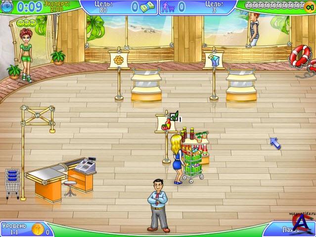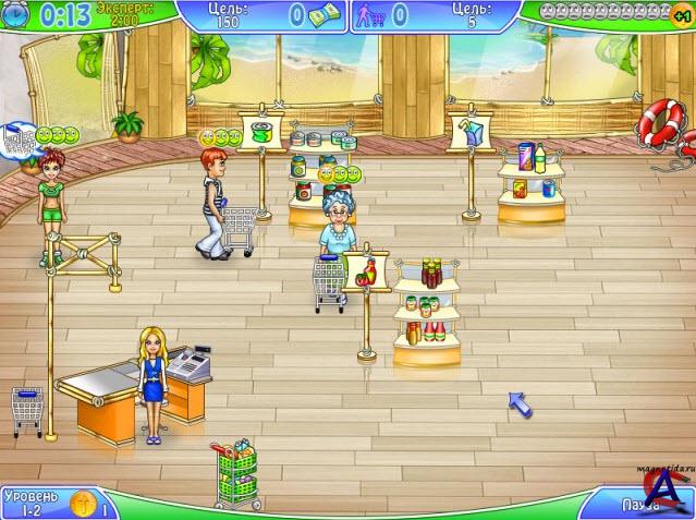 Торговый переполох. ЭКСКЛЮЗИВНО от NevoSoft.ru Эта история о девушке по имени Катя, недавняя выпускница колледжа. Теперь ей срочно нужно найти работу. Сев за руль своей машины, Катя решила объехать все близлежащие магазины. Но ее планам не суждено было осуществиться – Катя попала в огромную пробку. В отчаянии, боясь не успеть, отважная девушка выскочила из машины и начала регулировать движение, помогая водителям миновать опасное место. Тут то ее и заметил владелец одного супермаркета. Поразившись энтузиазму Кати, он, не задумываясь, предложил ей работу. В игре «Торговый переполох» вам придется примерить на себя роль управляющего супермаркетом. Заполнение полок товаром, помощь покупателям, работа на кассе, предоставление свободных тележек – все это ляжет на хрупкие плечи Кати. Вы должны помочь ей управиться с этими делами так, что бы покупатели уходили от вас как можно более довольными. Ведь от этого напрямую зависит количество полученных монеток. На эти монетки можно покупать новое и улучшать существующее оборудование. Отличный тайм-менеджер «Торговый переполох» обладает увлекательным сюжетом, красивой графикой и приятным звуковым оформлением. Забавно прорисованные персонажи обязательно вызовут улыбку и помогут отвлечься от повседневных забот.