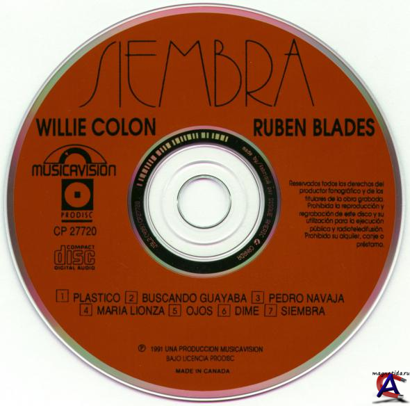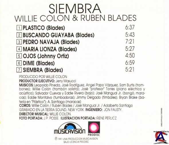 Рубен Блейдс (исп. Ruben Blades, 16 июля 1948, Панама) — панамский певец, композитор, актёр, наиболее прославившийся своими песнями в стиле "сальса" В десятилетнем возрасте Рубен увлёкся рок-н-роллом и бразильской музыкой. Затем, через год после поступления на факультет права в Национальный университет Панамы в 1967, Блейдс начинает петь и записываться с местными группами. В 1980 Рубен Блейдс делает нечто невиданное: первый в мире сальса-мюзикл «Maestra vida», изданный на пластинках, поставленный в театрах и на радио. В 1983 создает новую группу «Seis del Solar». Политическая карьера Блейдса терпит крушение — его партия «Papa Egoro» в 1994 проигрывает выборы. В 1996 Рубен получает Grammy за альбом «La rosa de los vientos». 1999 снова приносит Блейдсу Grammy — за альбом «Tiempos». Вильям Энтони Колон (William Anthony Colon) появился на свет в 1950 г. в Южном Бронксе, в самом сердце Латинского квартала, в семье пуэрториканцев. Первыми песнями, услышанными маленьким Вилли, были колыбельные, которые пела ему его бабушка Антония. По словам этих песен он учился говорить. И петь. Первую пластинку, «El Malo», Вилли записал когда ему было только 17 лет. Через год вышла вторая, «The Hustler», еще через год — «The Big Break — La Gran Fuga». В 1971 г. Колон записывает альбом рождественских песен «Аsalto Navideno» и в тот же год к нему приходит успех благодаря знаменитой «La murga». Вместе с Эктором Лавое записывает «оду Пуэрто-Рико» – «Canto a Borinquen». С 1970 по 1983 г. работает в «Fanнa Records» как продюсер и одновременно записывается. За это время шесть его альбомов получают статус золотых, три — платиновых, он получает три Grammy. В 1985 г. его англоязычные песни попадают в британские и американские чарты. В 1988 г. за «El Gran Varon» получает Grammy в номинации «Сальса-запись года». В 90-е годы Колон активно работает как продюсер, вместе с другими звездами сальсы участвует в грандиозном концерте, вышедшим на СD как «Perfecta Combinacion», а в 1997 г. снимается в «мыльной опере» «Demasiado corazуn» компании Azteca TV в роли агента Фелисиано Пинтора. Тогда же выходит в Мексике антология «Historia musical de Willie Colon», а в 1998 г. начинает выходить в эфир его телепрограмма «Willie’s Cafe» на мексиканском телевидении. На сегодняшний день Вилли Колон добился успехов в самых различных видах деятельности. Как музыкант, композитор, аранжировщик, певец, трубач, продюсер и директор собственной группы «Legal Alien», он выпустил 39 дисков, более 10 млн. копий которых было продано по всему миру, был 11 раз номинирован на Grammy, имеет 15 золотых и 5 платиновых дисков и записывался вместе с такими великими людьми, как Рубен Бладес, Дэвид Бирн, Эктор Лавое и Селия Крус. Его музыка, в которой чувствуется сильное влияние лэтин-джаза, одновременно сочетает в себе традиции и ритмы «тропикаль» и жесткие мотивы нью-йоркских улиц его юности, социальные ноты и лирику. Кроме того, Вилли Колон участвует в различных общественных проектах, в частности, в программе помощи странам третьего мира и обществе борьбы против СПИДа, занимается своей политической карьерой. И при этом успевает быть примерным семьянином, отцом четверых детей.