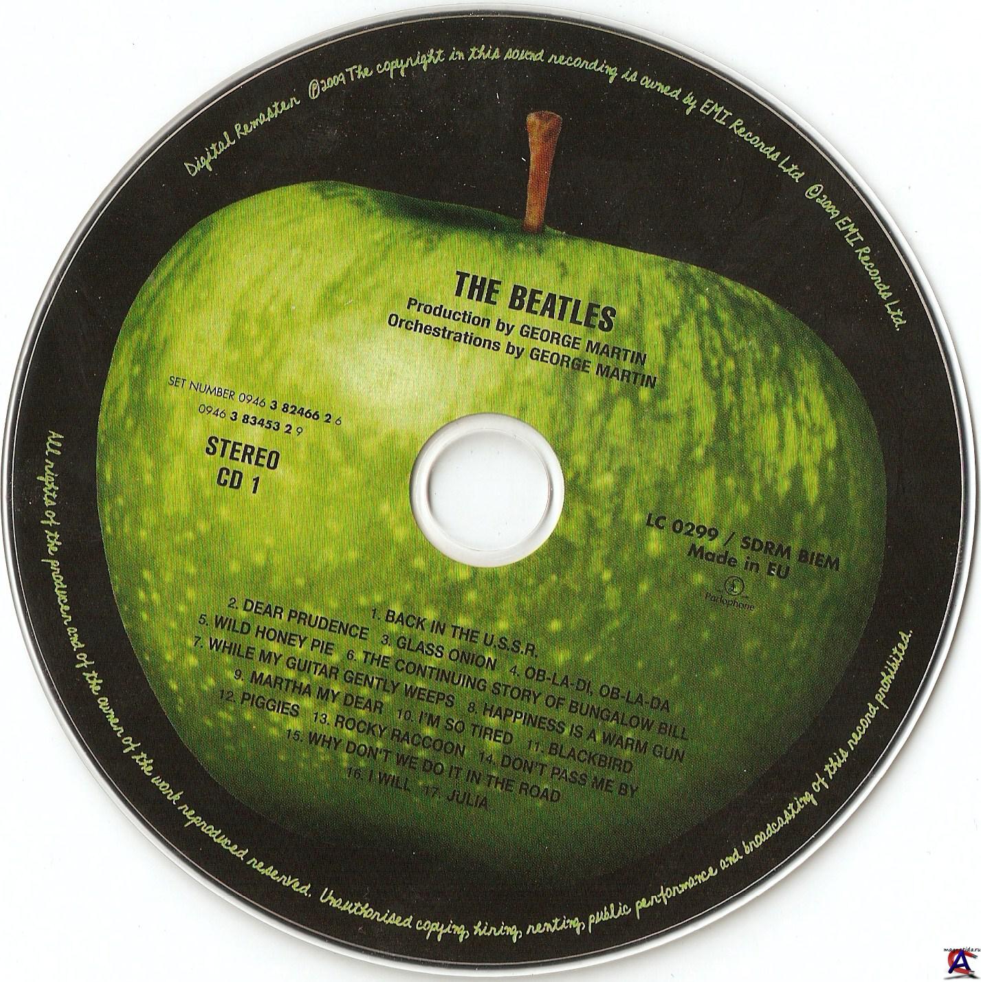 Трэклист CD1 1-1 Back In The U.S.S.R. 2:43 1-2 Dear Prudence 3:57 1-3 Glass Onion 2:18 1-4 Ob-La-Di, Ob-La-Da 3:08 1-5 Wild Honey Pie 0:53 1-6 The Continuing Story Of Bungalow Bill 3:14 1-7 While My Guitar Gently Weeps 4:46 1-8 Happiness Is A Warm Gun 2:43 1-9 Martha My Dear 2:29 1-10 I"m So Tired 2:03 1-11 Blackbird 2:18 1-12 Piggies 2:05 1-13 Rocky Raccoon 3:33 1-14 Don"t Pass Me By 3:50 1-15 Why Don"t We Do It In The Road? 1:42 1-16 I Will 1:46 1-17 Julia 2:54 CD2 2-1 Birthday 2:43 2-2 Yer Blues 4:01 2-3 Mother Nature"s Son 2:48 2-4 Everybody"s Got Something To Hide Except Me And My Monkey 2:25 2-5 Sexy Sadie 3:15 2-6 Helter Skelter 4:30 2-7 Long, Long, Long 3:04 2-8 Revolution 1 4:16 2-9 Honey Pie 2:41 2-10 Savoy Truffle 2:55 2-11 Cry Baby Cry 3:02 2-12 Revolution 9 8:22 2-13 Good Night 3:12
