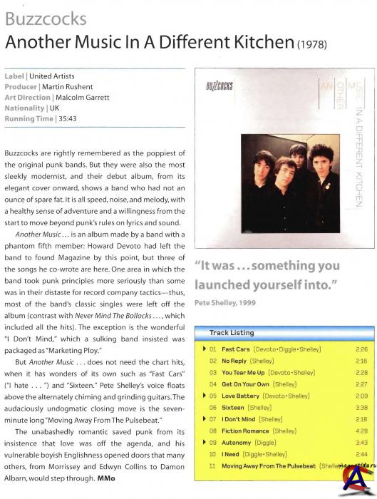 Подробнее 20 июля 1976 года состоялось первое выступление одного из наиболее влиятельных коллективов в истории британского панк-рока и альтернативной музыки. BUZZCOCKS тогда в составе Pete Shelley (гитара, вокал, настоящее имя Peter McNeish, 17.04.1955, экс-JETS OF AIR) Howard Devoto (Howard Trafford, вокал), Steve Diggle (бас-гитара) и John Maher (ударные) разогревали ошалевшую манчестерскую публику перед выступлением Sex Pistols и Damned. Группу собрал Devoto, который был студентом философии, а по совместительству — диким фэном Iggy & The Stooges. История создания весьма типична — Peter McNeisch и Howard Devoto вычитали в еженедельнике New Musical Express самую первую рецензию на выступление SEX PISTOLS и отправились в Лондон на них полюбоваться. Впечатления оказались более чем впечатляющими — парочка решила организовать выступление SEX PISTOLS в своем Манчестере, что и было сделано в зале Lesser Free Trade Hall. Это было первое крупное выстуление SEX PISTOLS за пределами родного города, и после него Pete и Howard сотворили собственную команду — BUZZCOCKS. В октябре 1976 Buzzcocks накатали одинадцатипесенное демо в музыкальном плане сильно походившее на SEX PISTOLS. Несколько концертов с другими пионерами британского панка сделали BUZZCOCKS имя и репутацию одной из сильнейших команд разгорающейся панк-революции. Среди посетителей первых концертов BUZZCOCKS было немало будущих знаменитостей — Peter Hook и Bernard Sumner (JOY DIVISION / NEW ORDER), Steven Morrissey (MORRISSEY / THE SMITHS) и продюсер Martin Hannet, позднее работавший с самими BUZZCOCKS, а также с JOY DIVISION, NEW ORDER, STONE ROSES и HAPPY MONDAYS. В январе 1977 вышел мини-альбом «Spiral Scratch» (с четырьмя песнями — «Breakdown». «Times Up». «Boredom» и «Friends Of Mine») на собственной фирме Devoto и Shelley New Hormones Records, которую они основали всего за 500 фунтов. Но, отыграв всего одиннадцать сейшенов с Buzzcocks, неожиданно слинял Devoto, который сотворил группу MAGAZINE, a в 1983 году разродился сольными делами. Steve Diggle немедленно перешел с баса на гитару, а бас-гитаристом стал Garth Smith из тех же JETS OF AIR. Контракт с EMI был подписан в день смерти Элвиса Пресли — 16 августа 1977, а спустя всего два месяца Англия услышала их первый сингл «Orgasm Addict». Группа стала находить свой уникальный стиль, фундаментом которого послужили STOOGES и RAMONES, что вылилось в смесь невероятно мелодичных поп-мелодий и жесткой ритм-секции, далеко не так примитивно устроенной, как у большинства панков-современников. 1977 год закончился новой сменой в бас-гитарном лагере — туда явился Steve Garvey, взамен Garth, который не смог достойно играть во время турне. В хит-парады группы попала с экспрессивным синглом «What Do I Get» — самой именитой и почитаемой и по сей день их композицией. Спустя два месяца, в апреле 1978 дебютный классический гигант «Another Music In A Different Kitchen» достиг пятнадцатого места. Группа завалила слушателей чередой хитов, будучи признанной самой талантливой сингловой панк-группой эпохи. Не прошло и года, и был уже готов второй альбом «Love Bites» (13 место), однако он оказался заметно мягче и сентиментальнее предшественника, не вызывая в слушателе такой же бурной адреналиновой реакции. К третьему лонгплею BUZZCOCKS немного исправились — появились снова жесткие, но в то же время мелодичные и веселые трэки. хотя не обошлось и без нововолновых вкраплений — группа стала одной из первых команд, нащупавших правильное звучание пост-панка. 26 место в британских чартах было обеспечено, а в сентябре 1979 под обильным давлением фэнов был переиздан дебютный мини-альбом «Spiral Scratch», загремевший на 31 ме