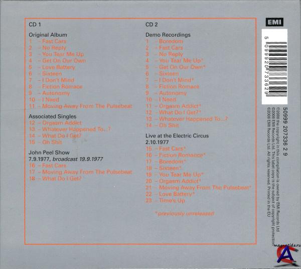 Трэклист CD1 Original Album 1-1 Fast Cars 2:27 1-2 No Reply 2:16 1-3 You Tear Me Up 2:27 1-4 Get On Our Own 2:27 1-5 Love Battery 2:09 1-6 Sixteen 3:38 1-7 I Don"t Mind 2:18 1-8 Fiction Romance 4:28 1-9 Autonomy 3:43 1-10 I Need 2:43 1-11 Moving Away From The Pulsebeat 7:07 Associated Singles 1-12 Orgasm Addict 2:04 1-13 Whatever Happened To...? 2:15 1-14 What Do I Get ? 2:56 1-15 Oh Shit 1:37 John Peel Show 7.9.1977, Broadcast 19.9.1977 1-16 Fast Cars 2:16 1-17 Moving Away From The Pulsebeat 4:45 1-18 What Do I Get ? 2:51