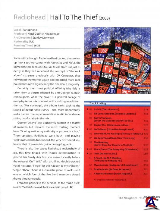Рецензия «Закончив с альбомами „Kid А" и ..Amnesiac", мы стали думать: в какую сторону нас теперь занесет?» — так рассуждал Том в интервью «The Daily Telegraph» после выхода в свет шестого альбома, названного «Hail То The Thief». Теперь он знал, что группе необходимы «заносы», чтобы порадовать публику и успокоить прессу. В этом заключалась новая и весьма причудливая форма давления на музыкантов: делайте что хотите, лишь бы новые работы радикально отличались от предыдущих. Том провел шесть месяцев в безделье, целиком посвятив себя обязанностям отца, пока Рэйчел не предложила: «Да запишитесь вы просто так, как получится. Без всякой программы и сроков». И это сработало. Эд О"Брайен рассказывает: «Идея состояла в том, чтобы записать альбом быстро и не слишком много думать о деталях. Для нас это было в новинку». Прежде участникам группы и в голову не приходило собирать альбом за такой короткий срок, но на этот раз они твердо решили попробовать новый метод. Они не могли позволить себе еще три года мучений вроде тех, что предшествовали альбомам «Kid А» и «Amnesiac». Музыканты вернулись на репетиционную площадку и в течение трех месяцев, как когда-то перед альбомом «ОК Computer», подготовили несколько песен, каждый день записывая результаты, а по вечерам прослушивая пленки. Но на этот раз Том отказался от привычки многократно переделывать одно и то же, доводя себя и окружающих до исступления. Вместо этого он позволил Джонни взять доработку деталей в свои руки. Он хотел избавить новую работу от бремени бесконечного анализа, свойственного предыдущим альбомам. Когда прошел слух об этих сессиях звукозаписи, фанаты приободрились, ожидая чего-то в духе ранних вещей группы. «Громкий звук и сплошные гитары, — объяснял Джонни. — Было просто здорово снова писать громкую музыку. Песни звучали свежо и красиво». В одном интервью он даже признался, что группа сделала кавер на «Сinпаmоn Girl Нила Янга, заново открывая для себя прелесть гитарных риффов. «За два дня репетиций мы раз десять или пятнадцать сыграли эту песню, — восторженно рассказывал он. — Громкие минорные аккорды, дисторшн — просто фантастика!» А затем, как и раньше, они отправились в путешествие с новыми песнями, начав гастрольный тур по Испании и Португалии. Том писал и переписывал песни непосредственно в ходе поездки, и нельзя было с уверенностью сказать, станет ли сегодняшняя версия песни окончательной. «Мы организовали небольшой тур, еще не зная, что в точности будем играть, — признался Том в интервью «Launch», — потому что только так можно было достаточно быстро собрать материал и привести его в порядок. Конечно, я зачастую писал ерунду, поскольку просто не хватало времени сочинять нормальные стихи. Но что вышло, то и вышло». А когда песни были готовы, музыканты собрались вернуться в студию, выбрав на этот раз Лос-Анджелес — столицу вампиров, населявших «Paranoid Android». Голливуд, пластическая хирургия, тяжелый рок и хэйр-метал — не самое подходящее место для Radiohead. Тем не менее Том был совершенно счастлив. Найджел Годрич предложил им записать очередной альбом на знаменитой студии «Осеап Way» в Голливуде. Именно там Брайан Уилсон чуть не спятил, пытаясь закончить «Good Vibrations» The Beach Boys, что идеально гармонировало с кропотливым подходом Radiohead. Хотя Том часто говорил о своей нелюбви к профессиональным студиям, шанс поработать в столь