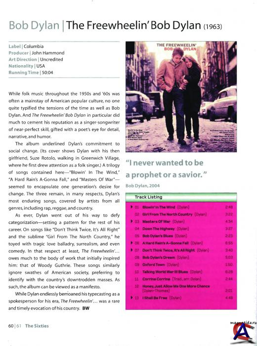 Трэклист 01 Blowin" In The Wind 2:49 02 Girl From The North Country 3:23 03 Masters Of War 4:38 04 Down The Highway 3:32 05 Bob Dylan"s Blues 2:28 06 A Hard Rain"s A-Gonna Fall 6:53 07 Don"t Think Twice, It"s All Right 3:40 08 Bob Dylan"s Dream 5:02 09 Oxford Town 1:50 10 Talkin" World War III Blues 6:27 11 Corrina, Corrina 2:44 12 Honey, Just Allow Me One More Chance 2:00 13 I Shall Be Free 4:47