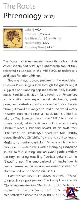 Подробнее Шедевральный хип-хоп-альбом, в котором между традиционными речитативами на повышенных тонах находится место всему что угодно — от душного попсового R`n`B до чистого панка и вполне привычной рок-музыки. Но сердцевину пластинки, разумеется, заполняет хип-хоп — логичный, умный и полнокровный. "Phrenology" — это очень современная, интересная и максимально разнообразная музыка, полубезумная, конечно, но довольно при этом доступная. Диск очень коллегиальный; среди гостей пластинки — Нелли Фуртадо, Талиб Квели и Джил Скотт. Два главенствующих хита обнаружить нетрудно — они звучат подряд, восьмой и девятый, The Seed 2.0 Ft. Cody Chesnutt и Break You Off Ft. Musiq. Композиции The Seed 2.0 Ft. Cody Chesnutt я бы выдал спецприз за наилучшее использование тривиальнейшего электрогитарного трень-брень в хип-хоповых целях. А то есть еще песня "Water" — мрачная десятиминутная сага, в которой на смену эксплицитной лирике певца в какой-то момент приходят красивые и страшноватые всплески музыки совсем уже неясного происхождения (собственно говоря, непонятно, чему я так радостно удивляюсь — The Roots как-никак группа со стажем, талантом и знанием дела). The Roots, пожалуй, единственная группа, которая органично чувствует себя как частью андерграунда, так и мейнстрима. Делая качественную музыку, основанную в большей части на «живых» инструментах, они не задумываются о продажах, но тем не менее всегда встречаются с одобрением. В их творчестве всегда чувствуется сильное влияние других направлений. Из The Roots вышел знаменитый продюссер Scott Storch, барабанщик ?uestlove успел поработать с большим количеством звезд R’n’B и хип-хопа от Jay-Z до D’Angelo, а MC Black Thought засветился не на одном альбоме прочих рэпперов. Российские слушатели могут хорошо знать эту группу по хиту You Got Me, вышедшему в 1999 году. Группа The Roots основана в городе Филадельфия. Их считают одними из основателей «живого рэпа». Они сфокусировали свое внимание на использовании «живых» инструментов, как на концертных выступлениях, так и в студийных записях. В 1987 году, когда рэппер Black Thought (Tariq Trotter) и барабанщик ?uestlove (Ahmir Khalib Thompson) познакомились в старших классах школы. Выступая на переменах, а позднее — на шоу талантов, они таким образом зарабатывали деньги и познакомились с басистом по имени Hub (Leon Hubbard) и рэппером Malik’ом B. Постепенно они перенесли свои выступления с улиц в клубы Филадельфии и Нью Йорка. Со временем становились все более высокооплачиваемыми и известными. Когда The Roots пригласили на хип-хоп концерт в Германии, чтобы представлять Соединенные Штаты, группа решила записать альбом, который можно бы было продавать после выступления. В итоге в 1993 появился «Organix», записанный на Remedy Records. Альбом разошелся тиражом 150 тысяч копий, после чего на группу посыпались предложения от ведущих лейблов звукозаписи, в результате чего The Roots вернулись в Америку уже заключившими контракт с Geffen Records. В 1995 году The Roots выпустили Do You Want More?!!!??!, который, нарушая хип-хоп традицию, был записан без сэмплирования и заранее записанных минусов. Рэп, исполненный под аккомпанемент джазовой музыки, не добился большой популярности у слушателей хип-хопа, и альбом получил статус золотого только в 2005 году. Такую неудачу в значительной степени компенсировал тот факт, что группу постоянно приглашали выступать на джаз-фестивали. В этот период к ним присоединяется битбоксер Rahzel «the Godfather of