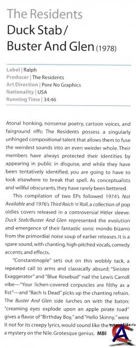 Подробнее Одна из отличительных особенностей коллектива — полная анонимность его участников, всегда скрывавшихся под масками, самые известные и узнаваемые из которых выполнены в виде глазных яблок, надетых на головы музыкантов. Естественно, имена Резидентов также скрываются. Известны только их псевдонимы: Мистер Синий Глаз, Мистер Зелёный Глаз, Мистер Красный Глаз и Мистер Череп (в соответствии с головными уборами, ставшими фирменным знаком). Впрочем, псевдонимы менялись время от времени. Так, например, в ходе мирового тура Talking Light 2010 года, у музыкантов появились «настоящие имена»: Рэнди (Randy), Чак (Chuck) и Боб (Bob). Бывший, четвёртый участник группы по имени Карлос (Carlos) устал от рок’н’ролла и уехал в Мексику ухаживать за своей мамой (с такой истории начиналось приветствие зрителей вокалистом The Residents). С самого начала и по сей день, менеджментом группы занимается специально созданная организация под названием The Cryptic Corporation, в которую первоначально входили четыре человека (Джей Клем (Jay Clem), Гомер Флинн (Homer Flynn), Харди Фокс (Hardy Fox) и Джон Кеннеди (John Kennedy)), категорически отрицающими своё участие в группе. Однако некоторые фэны подозревают, что Флинн — это вокалист, а Фокс — основной клавишник (Клем и Кеннеди давно покинули The Cryptic Corporation). В любом случае, подобные подозрения едва ли смогут найти реальные документальные или фото-видео подтверждения этого. По-крайней мере, пока сами The Residents не захотят раскрыть свою тайну. Тем не менее, имена некоторых музыкантов, участвовавших в живых выступлениях Резидентов известны и не скрываются (хотя и выступали-выступают в масках): Ларри Маллинс (Lurry Mullins) aka Тоби Дэммит (Toby Dammit) — барабаны, Нолан Кук (Nolan Cook) — гитара, Молли Харви (Molly Harvey) — вокал, Карла Фабрицио (Carla Fabrizio) — вокал, клавишные, Эрик Дрю Фелдман (Eric Drew Feldman) — клавишные, бас, аккордеон. Помимо этого, при записи некоторых альбомов Резидентам помогали различные музыканты, самые известные из которых, пожалуй, Крис Катлер (Chris Cutler) и Фрэд Фрит (Fred Frith). The Residents активно используют в творческом процессе новые технологии и постоянно экспериментируют, создавая параллельно с музыкой видео, мультимедийные CD-ROM и DVD. На счету у группы 3 CD-ROM-проекта, созданных в годы развития этой технологии: Freak Show (1994), The Gingerbread Man (1995) и полноценной игрой-квестом Bad Day On The Midway (1995). The Residents одними из первых создали видеоклипы. Когда MTV только появилось, их видеоклипы часто транслировались, так как тогда они составляли значительную часть малого количества доступных музыкальных видео. Ранние видео The Residents являются частью постоянной выставки в «Музее современного искусства» в Нью-Йорке, и были изданы на DVD «Icky Flix» в 2001 году. Музыка альбома «Eskimo» (1979) состоит из немузыкальных звуков, перкуссии, и бессловных голосов. Альбом хотели номинировать на Grammy, но этого не произошло, тем не менее, The Residents присутствовали на церемонии. Группа сделала диско-ремиксы композиций альбома, которые вышли на EP «Diskomo». «Eskimo» был переиздан в формате surround sound на DVD в 2003 году. «The Commercial Album» (1980) состоит из 40 композиций продолжительностью ровно по 1 минуте каждая, состоящих из одного куплета и припева. Предлагалось повторить каждую композицию три раза подряд, чтобы получилась поп-песня. The Residents купили 40 отдельных минут рекламного времени на популярной радиостанции KFRC из Сан-Франциско, тем самым вынудив радиостанцию п