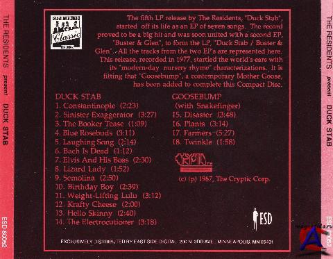 Трэклист Duck Stab 1 Constantinople 2:33 2 Sinister Exaggerator 3:27 3 The Booker Tease 1:09 4 Blue Rosebuds 3:11 5 Laughing Song 2:14 6 Bach Is Dead 1:12 7 Elvis And His Boss 2:30 8 Lizard Lady 1:52 9 Semolina 2:50 10 Birthday Boy 2:39 11 Weight-Lifting Lulu 3:12 12 Krafty Cheese 2:00 13 Hello Skinny 2:40 14 The Electrocutioner 3:18 Goosebump 15 Disaster 3:52 16 Plants 3:16 17 Farmers 5:27 18 Twinkle 2:00