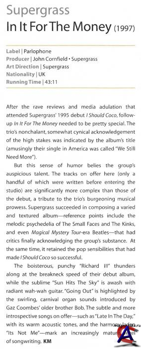 Если первый альбом Supergrass был по–настоящему диким, неоформленным, то второй — уже до конца продуманным, хорошо аранжированным и не таким быстрым. ‘’Он помедленней из–за того, что я не могу больше так быстро играть на концертах’‘, —– говорит, смеясь, Дэнни. У парней было время и были возможности. Они дорвались как мальчишки до сладостей. На ‘’In It For The Money’’ использована просто куча различных инструментов и студийного оборудования: синтезаторов, гитар, примочек и прочего. Альбом получил блестящие отзывы критиков и отлично продавался по всему миру. Supergrass заняли свою нишу. Из всех современных групп они, пожалуй, лучше всех передают неистовую энергетику, характерную для рокеров конца 60–х, таких как The Who и Stones. ‘’Когда мы только начинали, у нас практически не было никаких обязательств, но теперь у каждого из нас свой небольшой дом, а у меня и у Мики есть дети. Я по–прежнему рок–н–ролльщик, когда у меня есть настроение, но я знаю, что не могу быть таким все время. На самом деле, вам бы лучше прийти ко мне домой и посмотреть, потому что жизнь с двумя детьми — это еще тот рок–н–ролл’‘, —– смеется Дэнни. Однако вне зависимости от семейных обстоятельств, Supergrass продолжают гастролировать и обещают выпустить, по крайней мере, еще пять альбомов. Круто. Думаю, что при такой энергии и возможностях их будет двадцать пять, причем в ближайшие пять лет. Приятно, когда люди делают свое дело с душой. Если вы любите веселую, драйвовую, красивую и энергичную музыку, тогда без Supergrass вам никак не обойтись.