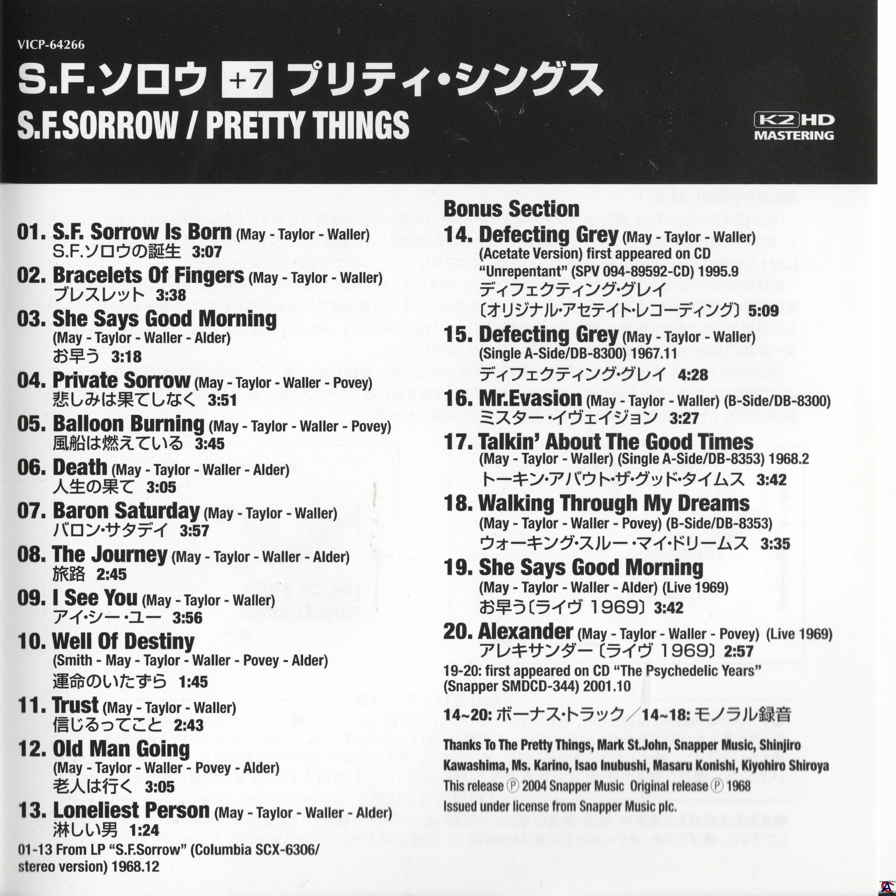 Трэклист 1 S.F. Sorrow Is Born 2 Bracelets of Fingers 3 She Says Good Morning 4 Private Sorrow 5 Balloon Burning 6 Death 7 Baron Saturday 8 The Journey 9 I See You 10 Well of Destiny 11 Trust 12 Old Man Going 13 Loneliest Person Bonus Tracks 14 Defecting Grey (Original Acetate Recording) 15 Defecting Grey (Single A-Side) 16 Mr. Evasion (Single B-Side) 17 Talkin" About the Good Times (Single A-Side) 18 Walking Through My Dreams (Single B-Side) 19 She Says Good Morning (Live 1969) 20 Alexander (Live 1969)