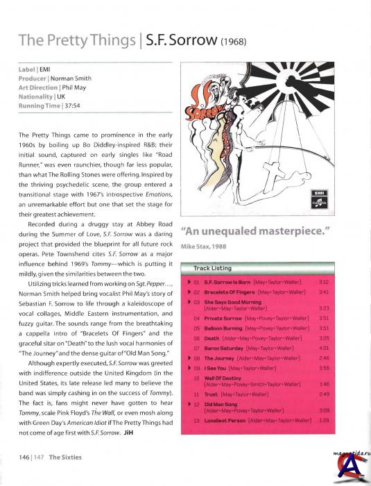 ЗАПИСЬ Запись S.F. Sorrow началась в ноябре 1967 с работы над композицией "Bracelets of Fingers". Две вещи, предназначавшиеся поначалу для альбома — "Talking About the Good Times" (Беседуя о хороших временах) и "Walking Through My Dreams" (Гуляя по моим снам) — вместо этого выпустили в феврале 1968 на сингле. Альбом еще не был завершен, как группу покинул ударник Скип Алан, увлеченный каким-то бурным романом. На его место пришел Джон Алдер из только что распавшейся лондонской группы психоделрока Tomorrow, известный всему Лондону под прозвищем Твинк. Запись проходила на легендарной студии Abbey Road, где в соседних помещениях примерно в то же время Pink Floyd записывали свой A Saucerful of Secrets (июнь 1968), а The Beatles — Белый альбом. S.F. Sorrow продюсировал Норман Смит по прозвищу Ураган, который участвовал в ранних записях The Beatles, записал дебютник Pink Floyd — The Piper at the Gates of Dawn (август 1967), и он же работал над их A Saucerful of Secrets. Звукоинженером был штатный работник EMI Питер Мью. Эти двое весьма способствовали тому, что The Pretty Things поэкспериментировали с новейшими технологиями, в том числе с меллотроном, электронными генераторами и прочими гаджетами, которые были в их распоряжении. Солист группы Фил Мэй позже высоко оценил вклад Нормана Смита, назвав его единственным из всех сотрудников EMI, кто оказал неоценимую поддержку проекту. Мэй особенно подчеркнул его техническую компетентность, без которой не получилось бы это амбициозное экспериментальное звучание S.F. Sorrow. Мэй даже назвал Смита "шестым участником" группы на том этапе. Интересно, что Пинк Флойд как раз наоборот остались сильно недовольны сотрудничеством в тот период с Норманом Смитом. S.F. Sorrow вышел в свет одновременно с легендарными альбомами The Beatles ("White Album"), The Rolling Stones — Beggars Banquet и The Kinks — The Kinks Are the Village Green Preservation Society. Это первое, что сгубило пластинку. EMI не прилагала особых усилий к его продвижению. Это второе. Все было против этого альбома, начиная с его содержания. Столь депрессивный сюжет вряд ли побуждал широкие массы людей бежать и покупать пластинку, ибо человек инстинктивно сторонится всего нежизнеутверждающего. Во-вторых, альбом несколько отставал во времени — эра психоделики 1967-го резко канула в Лету после массовых арестов и репрессий против ЛСД, а The Pretty Things продолжали петь "о полетах к Луне у ложки на спине". В третьих, выпуск S.F. Sorrow в США почему-то задержали более чем на полгода, а за это время в мире рок-музыки произошло событие, которое окончательно добило этот несчастливый альбом. Весной 1969 The Who выпустили альбом Tommy, который несмотря на более ранний S.F. Sorrow, стали называть — и до сих пор называют — первой рок-оперой, и Tommy сорвал все цветы и апплодисменты, которые не достались несчастному "С.Ф. Печалину". Вот уж поистине "как назовешь корабль — ..." Любители конспиративных теорий выискивали сходство между вступлением "Old Man Going" и "Pinball Wizard", в то время как циники шутили, что сходство между рок-операми лишь в том, что сюжеты обоих не имеют никакого смысла. На самом деле, между альбомами ничего общего. Записанный всего пять месяцев спустя после S.F. Sorrow, Tommy с его грандиозными инструментальными увертюрами звучит уже как продукт 1970-х, предвосхищая повальное увлечение прогрессивным роком. S.F. Sorrow с его ситарами, гитарными соло в обратном направлении и текстами о "положении головы на радугу" и "вытирании цветка из глаза" казалось застрял в хипповых шестидесятых. Мож
