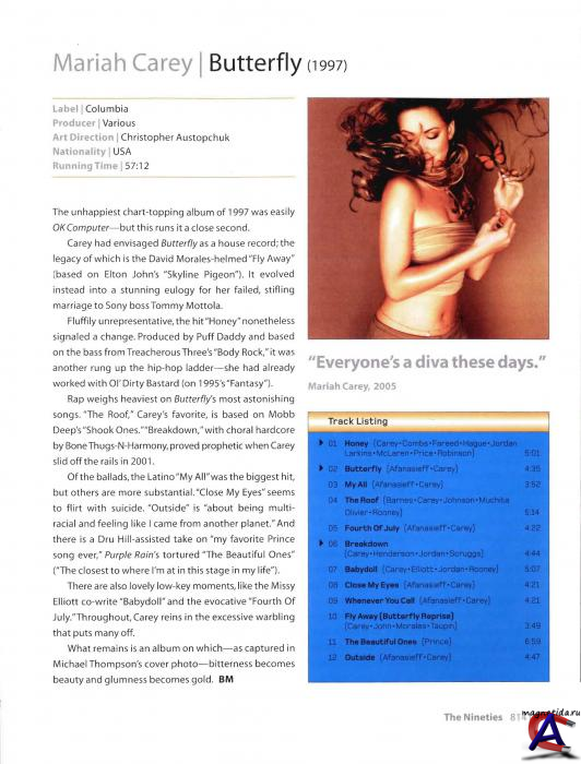 Подробнее Для работы над пластинкой приглашено множество музыкантов из мира хип-хоп, R&B и соул-музыки — Puff Daddy, The Bone Thugs-N-Harmony, Missy Elliott, Dru Hill, Mobb Deep, Q-Tip, Ma$e, Stevie J., Track Masters; в то же время певица продолжает сотрудничество с Walter Afanasieff, Dan Shea, Cory Rooney и David Morales. В первую неделю пластинка разошлась в США тиражом в 236 тысяч экземпляров и стартовала на первой строчке американского чарта Billboard 200. Тем не менее, суммарные продажи пластинки оказались не столь впечатляющими в сравнении с её предыдущими двумя мультиплатиновыми релизами. Первым синглом альбома выступила композиция «Honey», спродюсированная и написанная совместно с известным рэпером Puff Daddy, продюсерской командой The Ummah и Stevie J.; сингл стартовал с первой строчки Billboard Hot 100. Песня сопровождалась необычным для певицы музыкальным видео, где она сыграла Агента М. Марайя Кэри стала третьим ребенком в семье Патриши Хики, бывшей оперной певицы, и Алфреда Роя Кэри, авиационного инженера. От родителей Марайя унаследовала ирландские, африканские и венесуэльские корни. Семья распалась, когда девочке было всего три года. Матери Марайи приходилось работать на нескольких работах, чтобы прокормить детей. Однажды она пела отрывок из оперы и услышала, как дочь пытается подпевать ей – с тех пор Патриша начала заниматься вокалом с Марайей. В старших классах девушка часто отсутствовала на занятиях из-за работы, и ее за это прозвали Мираж. Едва окончив школу, Кэри уехала покорять Нью-Йорк. Ей повезло устроиться бэк-вокалисткой к известной певице Брэнде Кей Старр. Согласно легенде, в 1988 году Старр дала кассету с записью Кэри исполнительному продюсеру Columbia Records Томми Моттоле на одной из вечеринок. Моттола прослушал запись по дороге домой и был столь впечатлен, что вернулся обратно и разыскал Марайю. Подписав контракт со студией, Кэри сама участвовала в написании материала к своему дебютному альбому. Диск Mariah Carey увидел свет в 1990 году и принес поп-певице большой успех на родине. Сингл Vision Of Love принес артистке Grammy – вторую статуэтку она получила в номинации Лучший Новый Артист. Концерт 1992 года MTV Unplugged рассеял любые сомнения в натуральности голоса Марайи. Вторая работа Emotions была стилизована под мотаун-соул. Одним из синглов альбома стал кавер на песню The Jacksons I"ll Be There. Певица полюбилась всем своим имиджем соседской девчонки и необычайно богатым вокалом, а следующий ее альбом Music Box стал прорывом Марайи на мировую сцену. Пластинка запомнилась слушателям россыпью таких хитов, как любовная Dreamlover, поп-хит Hero и кавер Without You. В то же самое время стало известно о свадьбе Кэри и Моттолы, состоявшейся в 1993 году. Рождество Марайя отметила праздничным выпуском Merry Christmas. В 1995 году она смешала поп-музыку и R&B с хип-хопом на своей новой пластинке Daydream. Примерно в то же время она начала вводить моду на ремиксы известных поп-хитов – это новшество оказалось настоящей находкой для ночных клубов. В 1997 году она выпустила блестящий альбом Butterfly и сменила имидж на более сексуальный, однако в том же году последовал разрыв с Моттолой. После сборника хитов The 1"s Марайя записала R&B-ориентированный альбом Rainbow, запомнившийся публике игривым синглом Heartbreaker. Однако вслед за этим Кэри пришлось покинуть Columbia Records. Новый контракт с Virgin Records был разорван самой студией после провала фильма Glitter с Кэри в главной роли и негативных оценок одноименного диска. И