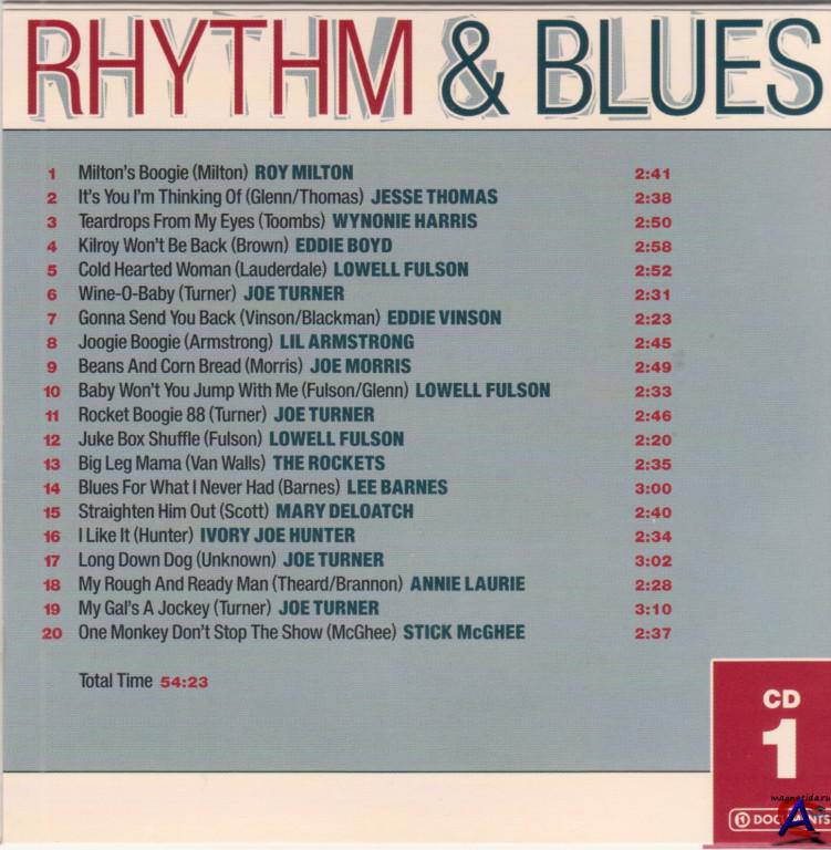 (CD 1) - time: 54:22 01 - Roy Milton - Milton"s Boogie 02:42 02 - Jesse Thomas - It"s You I"m Thining Of 02:38 03 - Wynonie Harris - Teardrops from My Eyes 02:51 04 - Eddie Boyd - Kilroy Won"t Be Back 02:58 05 - Lowell Fulson - Cold Hearted Woman 02:53 06 - Joe Turner - Wine-O-Baby 02:32 07 - Eddie Vinson - Gonna Send You Back 02:24 08 - Lil Amstrong - Joogie Boogie 02:46 09 - Joe Morris - Beans and Corn Bread 02:50 10 - Lowell Fulson - Baby Won"t You Jump with Me 02:34 11 - Joe Turner - Rocket Boogie 88 02:47 12 - Lowell Fulson - Juke Box Shuffle 02:21 13 - Rockets - Big Leg Mama 02:36 14 - Lee Barnes - Blues for What I Never Had 03:00 15 - Mary Deloatch - Straighten Him Out 02:41 16 - Ivory Joe Hunter - I Like It 02:35 17 - Joe Turner - Long Down Dog 03:03 18 - Annie Laurie - My Rough and Ready Man 02:29 19 - Joe Turner - My Gal"s a Jockey 03:10 20 - Stick McGhee - One Monkey Don"t Stop the Show 02:36