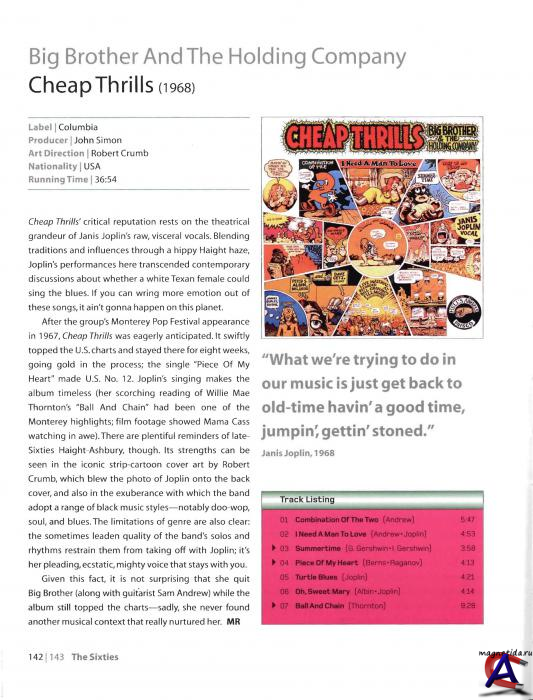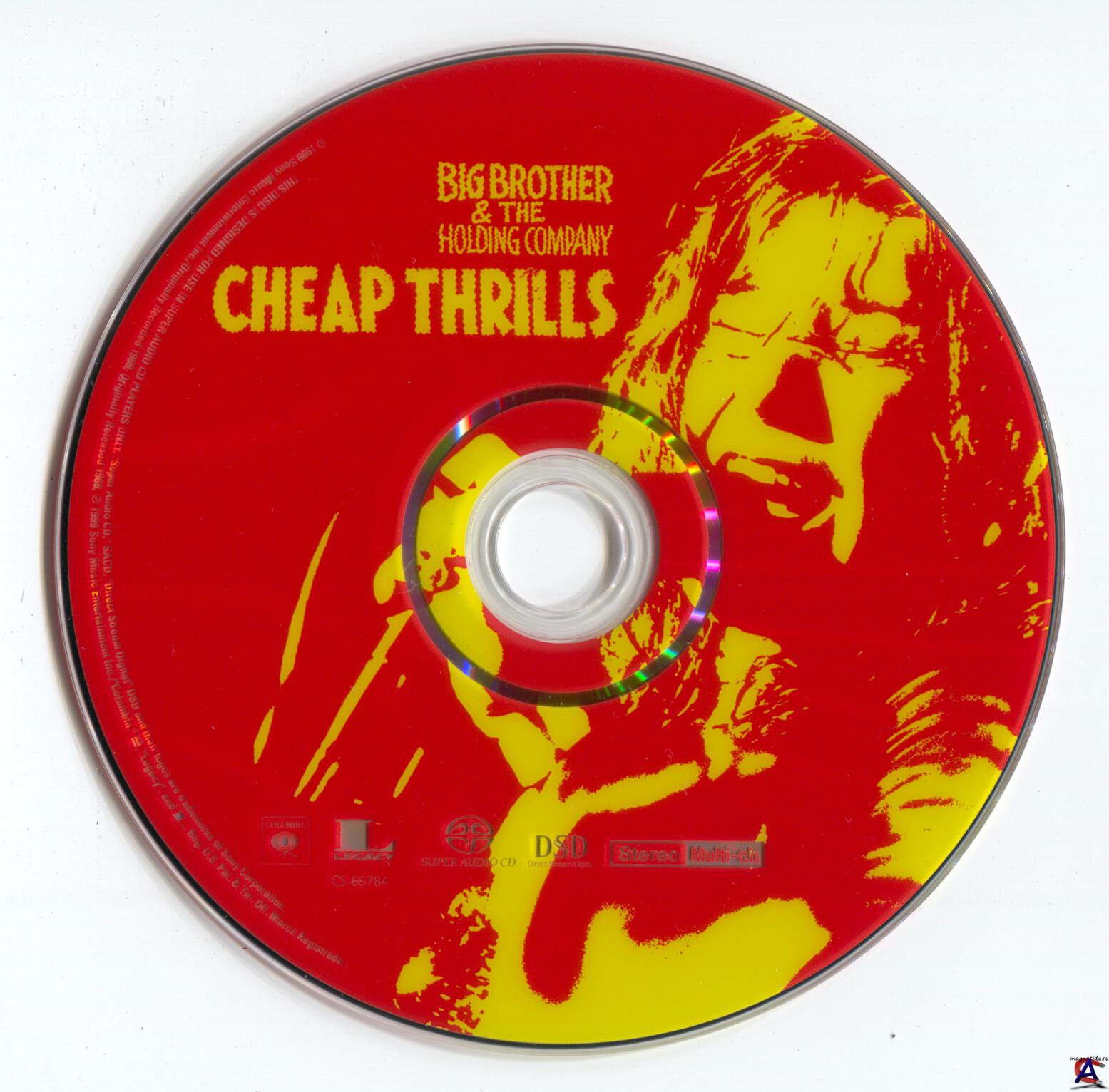 ВЫХОД В СВЕТ Альбом хотели назвать Sex, Dope and Cheap Thrills (Секс, наркотики и дешевые эффекты), но Columbia сразу зарубила этот вариант. Пришлось сократить до Cheap Thrills. Для обложки Columbia сфотографировала всю группу лежащих голыми на большой кровати посреди гостиночного номера, но музыкантам этот вариант не понравился, и они попросили создать что-нибудь художника андерграундных комиксов Р. Крамба. То, что планировалось на обратную сторону обложки, попало на лицевую, а на обратную Колумбия выбрала черно-белую фотографию Джанис. "Ball and Chain" оказалась единственной по-настоящему концертной записью альбома. В титрах значится, что она записана в зале Fillmore Билла Грэма, на самом деле в альбом попала запись, сделанная в сан-францисском зале Winterland Ballroom. Все остальные песни, несмотря на свое "концертное" звучание, записаны в студии. К ним просто добавлен шум толпы, а также вступление Билла Грэма перед первой песней альбома "Combination of the Two". Впрочем, иллюзия концерта неплохо срабатывает. Да и мучительные сессии не прошли даром, звучание максимально приближено к живому, особенно гитара Гёрли. Cheap Thrills вышел в свет в августе 1968, через год после дебютного. Ровно через два месяца — в октябре 1968 — альбом поднялся на 1-ое место и стал золотым (миллионный тираж). Он продержался на первом месте восемь недель, правда не подряд. Большим хитом был также сингл с альбома "Piece of My Heart". В Cheap Thrills вошло семь песен. Еще восемь песен, записанных на сессиях к этому альбому, выпускались на последующих пластинках Big Brother and the Holding Company, хотя Джанис покинула группу после Cheap Thrills. Три кавер-песни в альбоме — "Summertime", "Piece of My Heart", "Ball and Chain" — запечатлели Джанис Джоплин навеки во всей силе ее голоса, за которым чувствуется школа Большой Мамы Торнтон, Тины Тёрнер, Этты Джеймс и еще дюжины подобных голосистых женщин, ни одна из которых не была белой. Этот факт особенно поражал ее современников. "Я была поражена, увидев как эта белая женщина поет как Бесси Смит," — говорила Мишель Филлипс, певица из группы The Mamas & the Papas. Big Brother and the Holding Company стала разваливаться на самом пике своего успеха. Музыканты еще не могли забыть, как два года назад они сделали, по сути, одолжение этой не блещущей красотой лица и фигуры, никому неведомой девчонке, припершейся в вольный город Сан-Франциско из консервативного Техаса. Сделали одолжение, что брали петь в прославленный на Западном побережье коллектив. И целый год еще ушел на то, чтоб группе и ей притереться друг к другу. А теперь все вокруг только и говорили о ней, а их упоминали как недостойных "Ея Величества"... Что произошло дальше — очень понятно, если ко всем слабостям человечекой природы прибавить утомительное расписание гастролей, бесконечные переезды и жизнь в дороге. Начались трения, конфликты и т.п. В конце лета 1968, после выступления на фестивале во Дворце Изящных Искусств в Сан-Франциско, Джоплин объявила, что покинет Big Brother осенью того же года. Официальной причиной было названо ее желание начать сольную карьеру и создать соул-группу. Вместе с ней уходил один из основателей "Большого Брата и Холдинговой Компании" гитарист, аранжировщик и композитор Сэм Эндрю. Джоплин и Эндрю выступили в последний раз с Big Brother 1 декабря 1968 на одном благотворительном концерте в Сан-Франциско, а уже через двадцать дней они дали в Мемфисе первый концерт в составе новообразованной группы K
