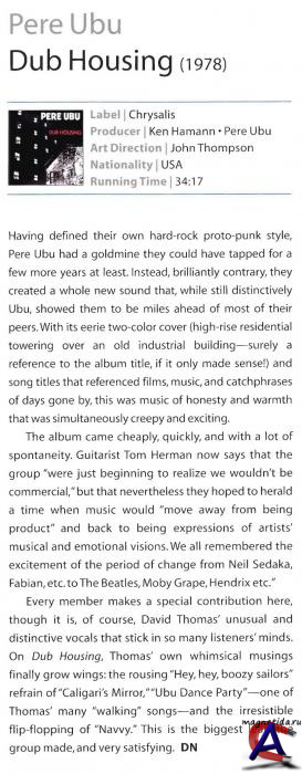 Подробнее Pere Ubu образовались в Кливленде, штат Огайо, в 1975 году после распада Rocket From The Tombs (остальные музыканты этой группы образовали The Dead Boys). Вокалист Дэвид Томас и гитарист Питер Лафнер (англ. Peter Laughner) вместе с Томом Херманом (гитара), Тимом Райтом (бас), Алленом Рэйвенстайном (клавишные) и Скоттом Крауссом (ударные) свой новый состав назвали именем персонажа пьесы французского драматурга Альфреда Жарри «Убю-король» («Ubu Roi»). Pere Ubu дебютировали с синглом «30 Seconds Over Tokyo» (о «рейде Дулитла»), за которым последовал «Final Solution» — радикальная интерпретация «Summertime Blues» Эдди Кокрэна, близкая к версии Blue Cheer. Оба сингла вышли на лейбле Hearthan Records, принадлежавшем Томасу. В 1977 году Лафнер покинул группу, а вскоре скончался от передозировки (AllMusic Guide отдает ему должное как одному из основателей кливлендской альтернативной сцены). На смену Райту (позднее вошедшему в состав видной No Wave-группы DNA, основанной Арто Линдсеем) пришел Тони Маймоун. После выхода третьего сингла «Street Waves» Pere Ubu подписались к Blank Records (филиалу Mercury) и выпустили The Modern Dance (Phonogram/Blank, 1978) — альбом, не имевший коммерческого успеха, но впоследствии получивший репутацию одного из самых значимых в музыкальной истории. Основными элементами эклектики Pere Ubu были в то время — жёсткая ритмичность (в духе краут-рока), несколько истерическая манера пения Томаса и аранжировки, отчасти заимствованные у гаражного рока 1960-х годов, насыщенные мрачным синтезаторным звуком и звуковыми эффектами. Кроме того, группа открыла новую разновидность кавер-версии, когда конечный результат практически ничего не имеет общего с оригиналом, кроме названия («Sentimental Journey», «Drinking Wine Spodyody»). В том же году на Radar Records вышел Datapanik in the Year Zero EP (с пятью композициями, ранее выпускавшимися лейблом Hearthan Records) и Dub Housing (Chrysalis) — альбом, ознаменовавший, как отметили критики, гигантский скачок вперед, как в качестве звучания так и по уровню материала. «Зловещая гитарно-клавишная структура, создаваемая усилиями Тома Хермана и Алана Равенстайна точными, убийственными ударами обрамляет потусторонний голос Томаса, словно изнывающего в замкнутости чужой непостижимой реальности», — пишет об альбоме Trouser Press. После выхода третьего альбома New Picnic Time (где в почти блюз-роковом контексте Томас стал смелее заявлять о своих религиозных чувствах) группа на время распалась, но собралась вновь после того, как Хермана заменил Мэйо Томпсон из группы Red Krayola. При его участии был записан The Art of Walking (1980), альбом, в котором появились эмбиентные мотивы. К моменту выхода Song of the Bailing Man (1982), альбома почти арт-рокового, отмеченного очищенным и разреженным звучанием, Краусса заменил Антон Фийр (The Feelies, Lounge Lizards). Вскоре Pere Ubu распались вновь: Краусс и Маймоун собрали Home & Garden, Томас начал сольную карьеру (его основными партнерами стали Ричард Томпсон и участники Henry Cow). В 1985 году вышел Terminal Tower, архивный сборник би-сайдов и раритета, снабженный, помимо текстов, пространными комментариями. В 1987 году, после того, как однажды в студии у вокалиста собрался практически весь старый состав, Pere Ubu реформировались и с участием Джима Джонса и Криса Катлера записали The Tenement Year (1988), сравнительно с предыдущими лёгкий и спокойный альбом, за которым последовал также почти мэйнстримовский Cloudland. Сингл из него, «Waiting For Mary», поднялся до #6 в списках Billboard Modern Rock Tracks и попал в ротацию MTV. Worlds i