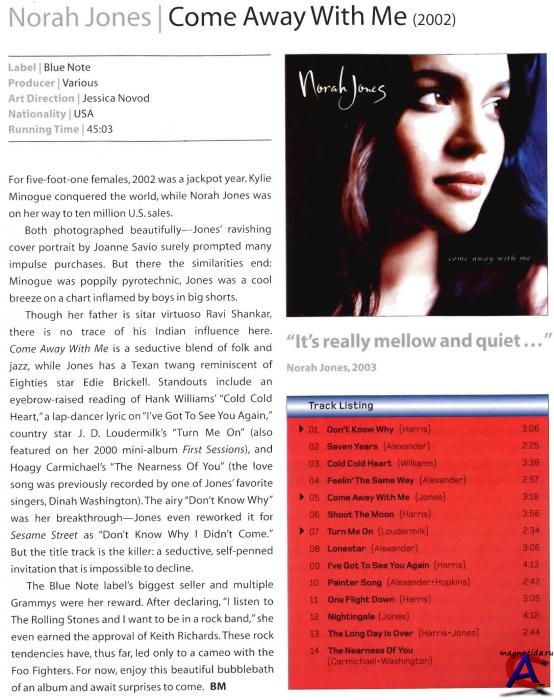 Подробнее Запись альбома происходила в Нью-Йорке на студиях звукозаписи Sorcerer Sound Studio и Allaire Studios в 2001 году. Выпущенный на преимуществено ориентированном на джазовых музыкантов лейбле и записанный с участием нескольких джазменов, альбом Come Away with Me был отмечен критиками за его акустический поп стиль и соединение элементов джаза, фолк-музыки, соул и кантри. Альбом имел ошеломительный коммерческий успех и положительную критику, возглавил главный альбомный хит-парад США Billboard 200 и несколько джазовых чартов. Альбом был сертифицирован как diamond по данным RIAA на 15 февраля 2005 года, когда его тираж составил более 10 млн копий за первые три года релиза. Нора Джонс (урожденная Гитали Нора Джонс Шанкар) родилась 30 марта 1979 года в Нью-Йорке в семье легендарного индийского музыканта и мастера игры на ситаре Рави Шанкар, и Сью Джонс, танцовщицы, чья любовь к музыке оставила неизгладимый отпечаток на будущей певице. Отец Норы практически не участвовал в воспитании дочери – в возрасте четырех лет мать увезла ее в пригород Далласа, штат Техас, где и начали проявляться таланты девочки. С раннего детства исполнительница обожала слушать мамины пластинки, в особенности ее завораживало творчество Билла Эванса, Билли Холидей и Уилли Нельсона, которого она до сих пор называет своим кумиром. Будучи школьницей, Нора начала петь в церковном хоре, параллельно обучаясь игре на пианино и гитаре. В 16 лет, с позволения родителей, певица официально сократила свое имя до Норы Джонс, под которым она и известна миллионам поклонников по всему миру, а в 17 выиграла престижную молодежную музыкальную премию Down Beat в категориях Лучший Джазовый Вокал и Лучшая Оригинальная Композиция. Вскоре после этого будущая звезда поступила в Университет Северного Техаса на специальность «джазовый пианист», но учеба продолжалась недолго – через два года Джонс переехала в родной Нью-Йорк, где сосредоточила все силы на музыкальной карьере. Создав группу со своими друзьями, гитаристом Джесси Харрисом, бас-гитаристом Ли Александром и барабанщиком Дэном Ризером, она записала несколько демо-композиций для знаменитого джазового лейбла Blue Note Records. Способности певицы не остались незамеченными, и в 2001 году студия заключила с Норой контракт, а еще через год вышел ее дебютный альбом под названием Come Away With Me, звучание которого представляло собой фортепианный джаз с легким оттенком соула и фолка. Данная работа изменила жизнь исполнительницы кардинальным образом – отзывы как слушателей, так и критиков были исключительно положительными, а на очередной премии вручения Grammy Джонс была номинирована на 8 наград, шесть из которых, включая Альбом Года и Лучший Новый Исполнитель, достались ей по праву. Популярность пластинки можно оценить по количеству продаж – 18 миллионов копий по всему миру. Все эти факты говорили о том, что певицу ждет долгая и успешная карьера. В 2004 году вышла ее вторая работа, Feels Like Home – сочетание фортепианного джаза в искусном исполнении Джонс и ритмов блюза и кантри. Как и его предшественник, альбом моментально выделился на фоне записей других исполнителей – уже через неделю после релиза количество проданных копий перевалило за миллион, а ставший хитом сингл Sunrise завоевал награду Grammy в категории Лучший Женский Поп-Вокал. Отправившись в турне в поддержку альбома, певица не теряла в