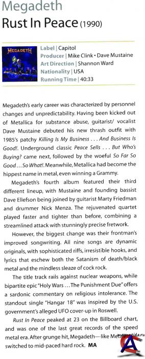 Рецензия на альбом Есть такой класс альбомов, которые сами участники записавших их групп считают невозможным превзойти, и после их выхода меняют направление своих творческих поисков, не начиная заведомо неудачных гонок. Rust in Peace, выпущенный Megadeth в 1990 году, однозначно относится к этой категории, ведь поклонники группы практически в один голос называют его лучшим из всей её дискографии, а отрицать его существенное влияние на жанр не берётся практически никто. В Rust in Peace сочетаются все лучшие черты thrash metal: изобретальная, безумно быстрая музыка; песни на политические, военные и экологические темы (отличительная черта как самой Megadeth, так и всего жанра) и высокая концептуальность, которая подчёркивается великолепной обложкой в исполнении знаменитого Ed Repka. На ней изображены пять тогдашних мировых лидеров, пришелец и полюбившийся с предыдущих альбомов персонаж Vic Rattlehead (символ группы). Стоит отметить изменение в составе Megadeth перед записью этого альбома: помощником гитариста и основателя группы Dave Mustaine стал Marty Friedman, которого наверняка знают многие любители инструментальной музыки. Приход столь квалифицированного музыканта помог Mustaine в полной мере реализовать все свои творческие замыслы, ведь теперь участников группы не могли сдерживать какие-либо рамки в технике владения инструментом. Ритмические фигуры, как и гитарные партии на Rust in Peace — один из лучших образцов игры на электрической гитаре в своём жанре. Всего в Rust in Peace девять композиций, каждая из которых обладает логической завершённостью и имеет свою «изюминку», любовно вложенную музыкантами. Так, в Holy Wars ей стал фрагмент, исполненный Marty Friedman на акустической гитаре, в Take No Prisoners — резкие выкрики бас-гитариста, в Dawn Patrol — прочитанные, а не пропетые слова, в Poison Was the Cure — скоростные переливы нот в инновационной главной теме. Альбом сразу же врезается в память, и слушатель горит желанием возвращаться к нему снова и снова. Вокал Dave Mustaine всегда был спорным вопросом для Megadeth. Даже искренние почитатели группы признают, что некоторые песни из предыдущих работ испорчены его пением. Но, в Rust in Peace, Dave старался изо всех сил, и, как итог, его пресловутый приём «snarling» вышел очень красивым и подходящим к музыке. Rust in Peace — один из лучших в тяжёлой музыке образцов свежести идей, техники игры и творческого воображения музыкантов. Знакомство с ним принесёт немало удовольствия не только приверженцам экстремальной музыки, но и людям, желающим просто послушать изысканную игру на гитаре. (с)rockmonster.ru