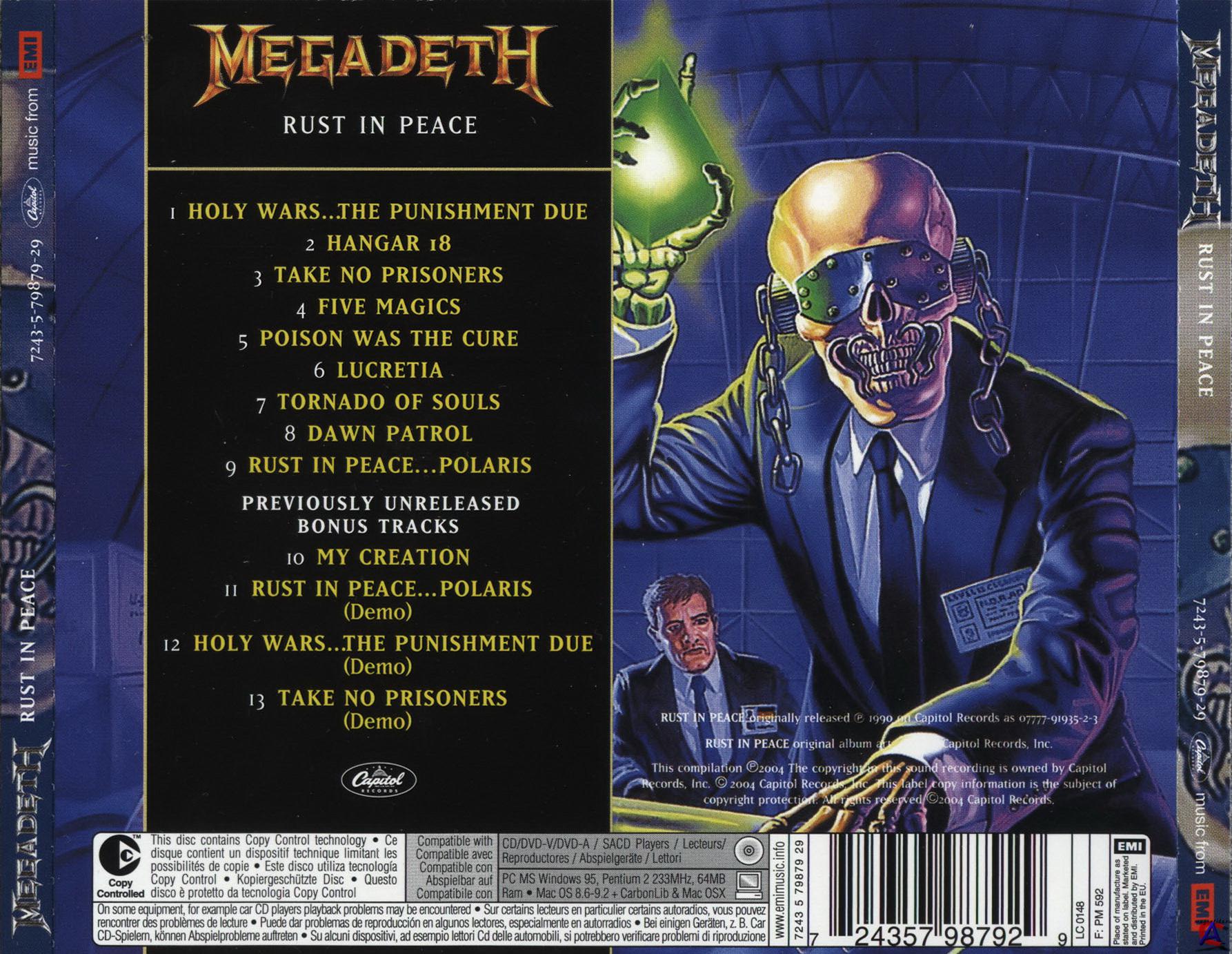Трэклист 01 Holy Wars...The Punishment Due 6:32 02 Hangar 18 5:11 03 Take No Prisoners 3:27 04 Five Magics 5:39 05 Poison Was The Cure 2:56 06 Lucretia 3:56 07 Tornado Of Souls 5:19 08 Dawn Patrol 1:51 09 Rust In Peace...Polaris 5:44 10 My Creation 1:36 11 Rust In Peace...Polaris (Demo) 5:25 12 Holy Wars...The Punishment Due (Demo) 6:16 13 Take No Prisoners (Demo) 3:23