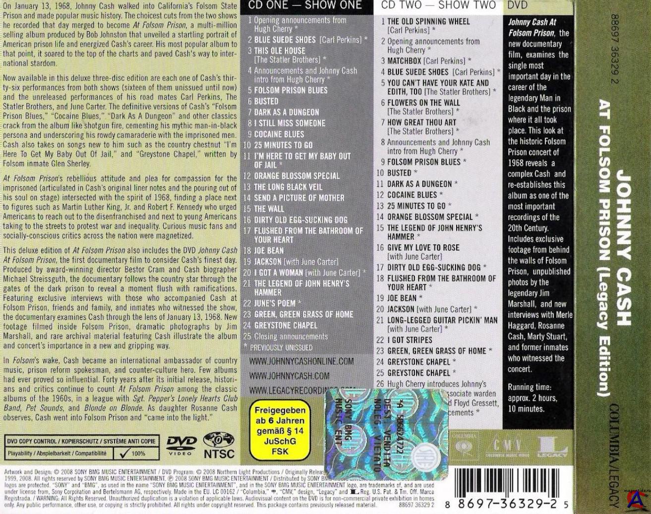 Трэклист Show One 1-1 Opening Announcements From Hugh Cherry 1-2 Blue Suede Shoes 1-3 This Ole House 1-4 Announcements And Johnny Cash Intro From Hugh Cherry 1-5 Folsom Prison Blues 1-6 Busted 1-7 Dark As A Dungeon 1-8 I Still Miss Someone 1-9 Cocaine Blues 1-10 25 Minutes To Go 1-11 I"m Here To Get My Baby Out Of Jail 1-12 Orange Blossom Special 1-13 The Long Black Veil 1-14 Send A Picture Of Mother 1-15 The Wall 1-16 Dirty Old Egg-Sucking Dog 1-17 Flushed From The Bathroom Of Your Heart 1-18 Joe Bean 1-19 Jackson 1-20 I Got A Woman 1-21 The Legend Of John Henry"s Hammer 1-22 June"s Poem 1-23 Green, Green Grass Of Home 1-24 Greystone Chapel 1-25 Closing Announcements