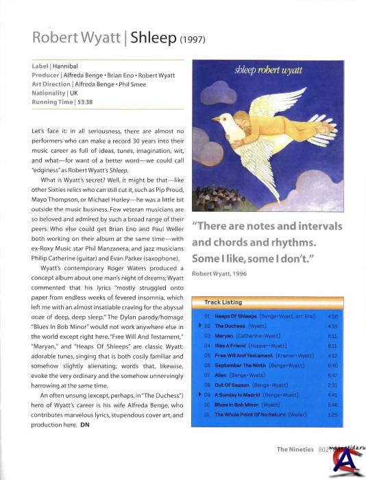 Подробнее В 1964 году появилась группа Wildе Flowers, через пару лет — Soft Machine, названная по роману Бэрроуза. Robert Wyatt числился в ней ударником, певцом и сочинителем некоторых замысловатых композиций. После американского турне 1968 года Wyatt остался в Калифорнии, подрабатывая сессионным музыкантом и делая первые сольные демо-записи. Дебютный альбом вышел в 1970 году под названием «The End of an Ear» (Краешек уха), записанный с бригадой из шести музыкантов, сам Уайт взял на себя ударные, фортепиано и голос. Вернувшись ненадолго в Soft Machine, Wyatt записал свой последний в составе этой группы альбом и создал новое объединение — Matching Mole, просуществовавшее до 1972 года. 1 июня 1973 года во время вечеринки, с музыкантом случилось несчастье — нетрезвый Уайатт выпал из окна третьего этажа и очень сильно повредил позвоночник, что привело к частичному параличу — вся нижняя часть тела была обездвижена. Приговоренный к инвалидной коляске, Роберт полгода провел в клинике, где сочинил Rock Bottom, изданный в 1974 году. Записывать пластинку ему помогали очень многие — Ник Мэйсон из Pink Floyd, Майк Олфилд, старые приятели Ричард Синклэйр и Нью Хоппер, саксофонист Гэри Уиндоу, альтист Фред Фрит и Альфреда Бенге, ставшая на долгие годы музой и ангелом-хранителем Уайта. Альбом получил несколько наград, в том числе гран-при французской Академии Шарля Кро. Через год появился фри-джазовый Ruth Is Stranger Than Richard, тогда же Wyatt выступил в Лондоне, Риме и Париже, впоследствии больших концертов он не давал. Только через пять лет, в начале 80х Уайт снова заявил о себе — руководитель независимого лэйбла Rough Trade, Джеф Трэвис предложил ему записать серию синглов с кавер-версиями, позже вошедших в сборник Nothing Can Stop Us — своеобразную музыкальную политическую карту мира и времени — наряду с чилийской «Arauco» звучит «Stalin Wasn’t Stallin’», кубинская народная песня «Caimanera» соседствует с профсоюзным гимном «Trade Union», исполненным хором бенгальцев. Наибольший успех выпал на долю баллады «Shipbuilding», написанной Элвисом Костелло как протест против англо-аргентинской войны за Фолклендские острова. Завершалась пластинка и вовсе не музыкально — барбадосский поэт Питер Блэкмэн читает поэму «Сталинград»! В те же годы Wyatt записал саундтрэк к фильму в защиту животных «Animals Film», посвященному проблеме использования животных в медицинских опытах. Затем вышел миньон Work In Progress (1984) и полнометражный альбом Old Rottenhat (1985) и музыкант снова иcчез из поля зрения на долгие пять лет, переехав с женой в Испанию, где она работала над стихотворным циклом, позже вдохновившим Роберта на создание альбома Dondestan (1991). Записав EP A Short Break годом позже и раздав бесчисленное количество интервью, Wyatt долго не дает о себе знать, лишь эпизодически участвуя в проектах других музыкантов. Очередной альбом Shleep, вышедший в 1997 году, был записан с помощью большой компании приглашенных музыкантов в студии Фила Манзанеры, безвозмездно предоставившего оборудование и студийное время. Также Wyatt участвовал в записи саундтрека к «Птицам» Бруно Кулэ. В 2003 году свет увидела пластинка Cuckooland. Последний на сегодняшний день сольный альбом мастера вышел в 2007 году и носит название Comicopera.
