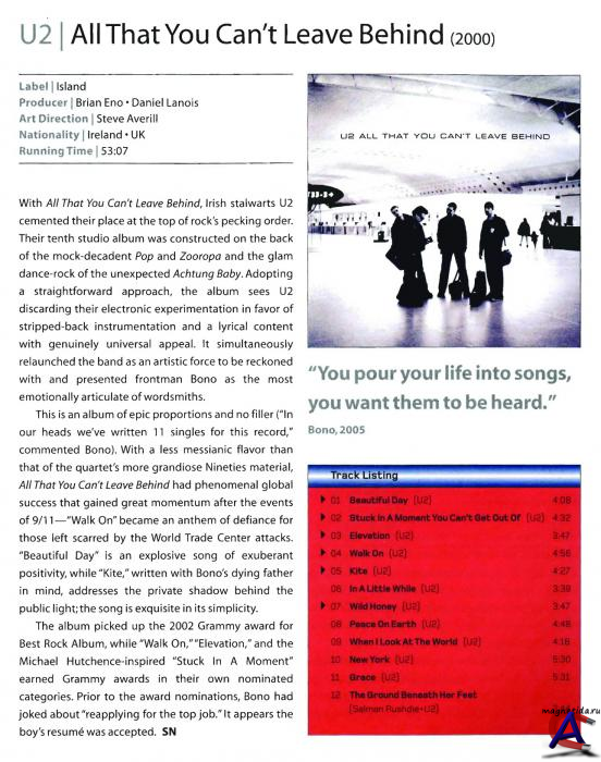 Подробнее Уже давно пора принять за прописную истину, что так же, как солнце восходит на востоке, за днем приходит ночь, а вслед за осенью наступает зима, — U2 является командой, которая не выпускает проходных альбомов. Десятое студийное творение монстров современной рок-музыки из Дублина, вознесено критиками в разряд музыкальных шедевров, сравнимое по значимости с предыдущими эпохальными работами группы — "The Joshua Tree" (1987) и "Achtung Baby" (1991). U2 всегда стояли и продолжают крепко стоять в авангарде новомодных тенденций и веяний современной музыки, являясь законодателями музыкальной моды и образцом профессионализма и стиля. Но на этот раз они не пошли по собственному протоптанному пути и решили отказаться от использования последних достижений и экспериментов в области электронных технологий — того, чем они занимались в последних альбомах "Zooropa" и "Pop". Правда, полностью отказаться от наработанного им не удалось, но всю электронику они гармонично увели на задний план, отдав ведущие позиции живым инструментам. Вернувшись к классическому саунду, характерному для "Achtung Baby", музыканты попытались сделать звучание еще более мелодичным и мягким. "Мы хотели увидеть, на что способна рок-группа в начале XXI столетия. Фактически единственная вещь, которая бы соответствовала в данный момент имиджу настоящей рок-группы, — это способность писать песни, которые бы существовали независимо от времени,в которое они были написаны", — говорит о пластинке Боно. "All That You Can"t Leave Behind" представляет собой своеобразный отчет музыкантов о проделанном творческом пути длиною в два десятилетия и является совокупностью непрерывно струящихся красивых мелодий, которым U2, как никогда раньше, придали наиважнейшую роль при написании альбома. "Я только пытаюсь найти нормальную мелодию, — проникновенно поет Боно в композиции "Stuck in a Moment You Can"t Get Out Of", - песню, которую я могу спеть в компании". Воссоединившись со своими давними продюссерами Брайаном Ино и Дэниэлом Лэнойсом для записи "All That You Can"t Leave Behind", U2 стремились воссоздать на альбоме забытое звучание поп-музыки 60-х, классического R&B и соула, но получившийся результат представляет собой качественно новое звучание. Правда, не узнать свойственную только U2 манеру игры просто невозможно. Вокал Боно все так же скачет по всему частотному диапазону: то он низок, немного хрипловат и спокоен, то вдруг резок и проникновенен, взлетая до фальцета. Гитары Эйджа и Клейтона, по сравнению с предыдущими работами, звучат немного скромнее, но по-прежнему живо и энергично, давая понять, что это все те же простые ирландские парни, которые благодаря таланту и работоспособности в один прекрасный день проснулись суперзнаменитыми. Музыканты U2, взорвав хит-парады синглом "Beautiful Day" из нового альбома, уверенным шагом вступили в третье тысячелетие, продолжая и дальше гордо нести знамя одной из самых сильных и амбициозных рок-групп 80-90-х годов и не собираясь останавливаться на достигнутом.