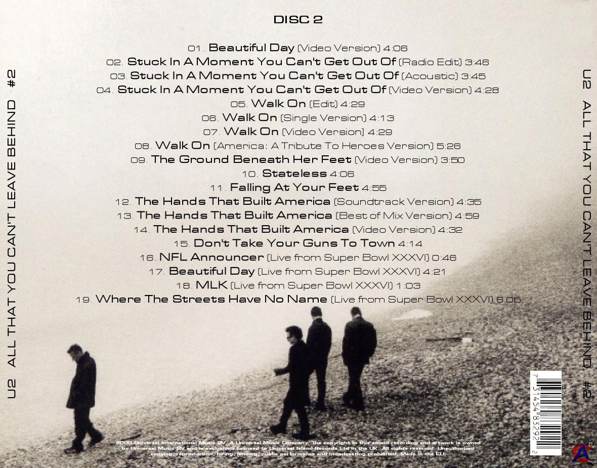 CD2 01. Beautiful Day (Video Version) [4:06] -DVDA- 02. Stuck In A Moment You Can"t Get Out Of (Radio Edit) [3:46] 03. Stuck In A Moment You Can"t Get Out Of (Acoustic) [3:45] 04. Stuck In A Moment You Can"t Get Out Of (Video Version) [4:28] -DVDA- 05. Walk On (Edit) [4:29] 06. Walk On (Single Version) [4:13] (Remixed by Nigel Goodrich) 07. Walk On (Video Version [4:29] 08. Walk On (America: A Tribute To Heroes Version) [5:26] 09. The Ground Beneath Her Feet (Video Version) [3:50] -DVDA- 10. Stateless [4:06] 11. Falling At Your Feet [4:55] 12. The Hands That Built America (Soundtrack Version) [4:35] 13. The Hands That Built America (Best of Mix Version) [4:59] 14. The Hands That Built America (Video Version) [4:32] -DVDA- 15. Don"t Take Your Guns To Town [4:14] (Recorded for the Tribute to Johnny Cash, in Dublin, April 1999) 16. NFL Announcer (Live from Super Bowl XXXVI) [0:46] -DVDA- 17. Beautiful Day (Live from Super Bowl XXXVI) [4:21] -DVDA- 18. MLK (Live from Super Bowl XXXVI) [1:03] -DVDA- 19. Where The Streets Have No Name (Live from Super Bowl XXXVI) [6:05] -DVDA-