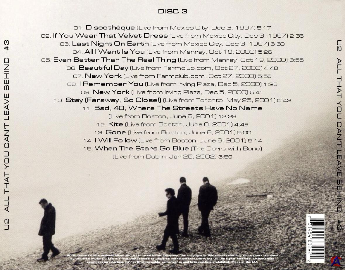 CD3 01. Discothиque (Live from Mexico City, December 3, 1997) [5:17] 02. If You Wear That Velvet Dress (Live from Mexico City, December 3, 1997) [2:36] 03. Last Night On Earth (Live from Mexico City, December 3, 1997) [6:30] 04. All I Want Is You (Live from Manray, October 19, 2000) [5:26] 05. Even Better Than The Real Thing (Live from Manray, October 19, 2000) [3:55] 06. Beautiful Day (Live from Farmclub.com, October 27, 2000) [4:48] 07. New York (Live from Farmclub.com, October 27, 2000) [5:58] 08. I Remember You (Live from Irving Plaza, December 5, 2000) [1:28] 09. New York (Live from Irving Plaza, December 5, 2000) [5:41] 10. Stay (Faraway, So Close!) (Live from Toronto, May 25, 2001) [5:42] 11. Bad, 40, Where The Streets Have No Name (Live from Boston, June 6, 2001) [12:28] 12. Kite (Live from Boston, June 6, 2001) [5:27] 13. Gone (Live from Boston, June 6, 2001) [5:00] 14. I Will Follow (Live from Boston, June 6, 2001) [5:14] 15. When The Stars Go Blue (Live from Dublin, January 25, 2002) (The Corrs with Bono) [3:59]