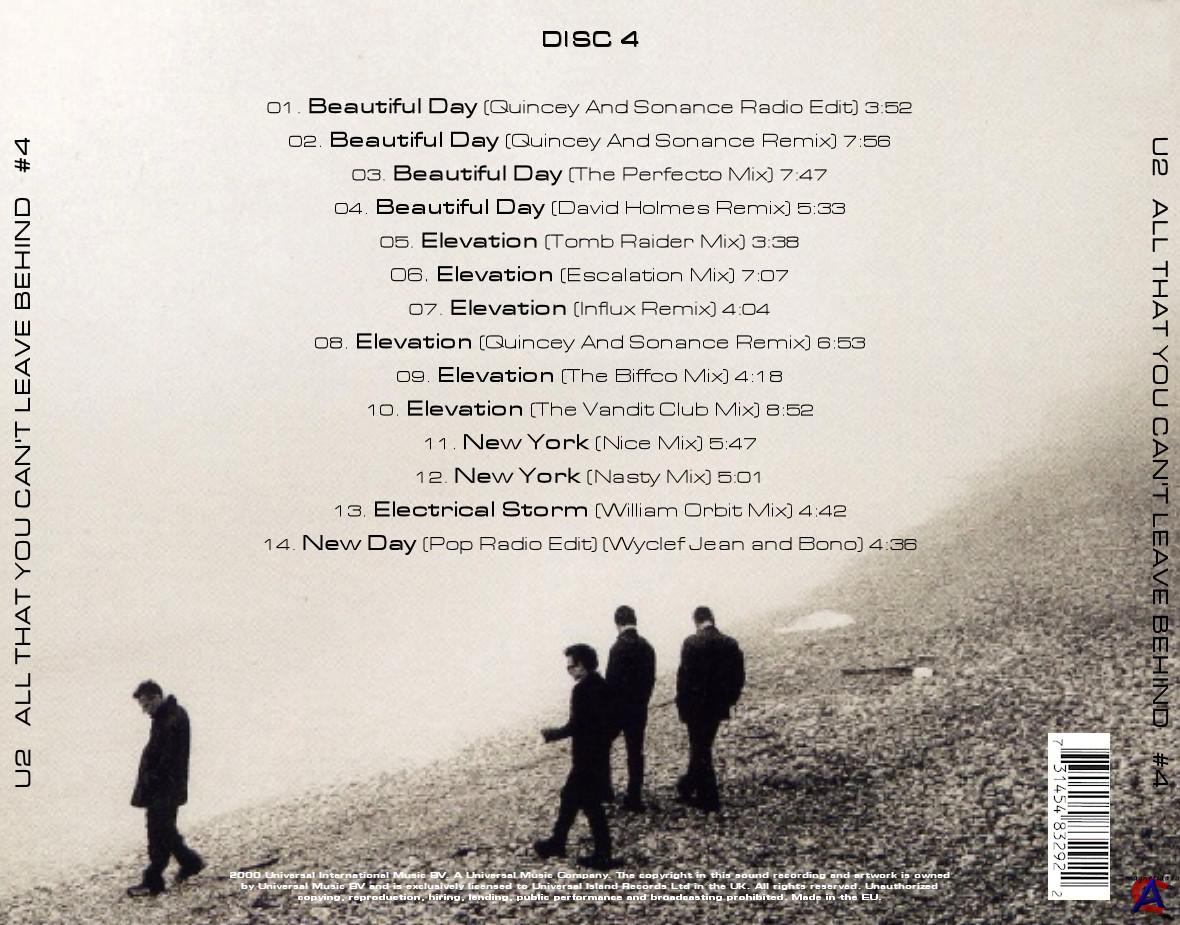 CD4 01. Beautiful Day (Quincey And Sonance Radio Edit) [3:52] 02. Beautiful Day (Quincey And Sonance Remix) [7:56] 03. Beautiful Day (The Perfecto Mix) [7:47] 04. Beautiful Day (David Holmes Remix) [5:33] 05. Elevation (Tomb Raider Mix) [3:38] 06. Elevation (Escalation Mix) [7:07] 07. Elevation (Influx Remix) [4:04] 08. Elevation (Quincey And Sonance Remix) [6:53] 09. Elevation (The Biffco Mix) [4:18] 10. Elevation (The Vandit Club Mix) [8:52] 11. New York (Nice Mix) [5:47] 12. New York (Nasty Mix) [5:01] 13. Electrical Storm (William Orbit Mix) [4:42] 14. New Day (Pop Radio Edit) (Wyclef Jean and Bono) [4:36]