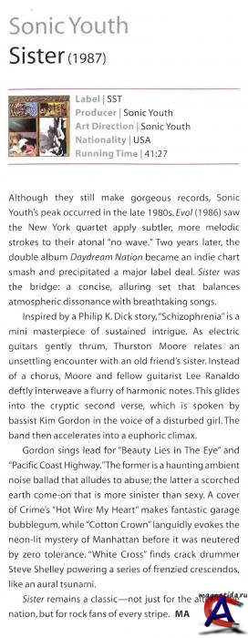 Подробнее Aльбом "Sister", вышедший в 1987 году, был восторженно встречен рецензентами и получил высокую оценку даже на страницах журнала "Rolling Stone". От самодостаточных экспериментов с диссонансным, искаженным саундом, с перепадами громкости и эмбиентными гармониями команда перешла к более продуманным, глубоким композициям, которые отличались не только оригинальностью, но и теплотой и обаянием. Первоначально альбом хотели назвать "Kitty Magic" и украсить его фотографиями кошечек фанатов группы......но.....получили "Sister" и никаких кошек там не было. Это был самый ровный альбом за весь тот период существования SY и слушался на одном дыхании. Содержал великолепные вещи вроде "White Cross", "Catholic Block", "Tuff Gnarl" песню легендарной хард-коровой калифорнийской группы "Crime" и гимн Нью-йоркского андеграунда "Cotton Crown"