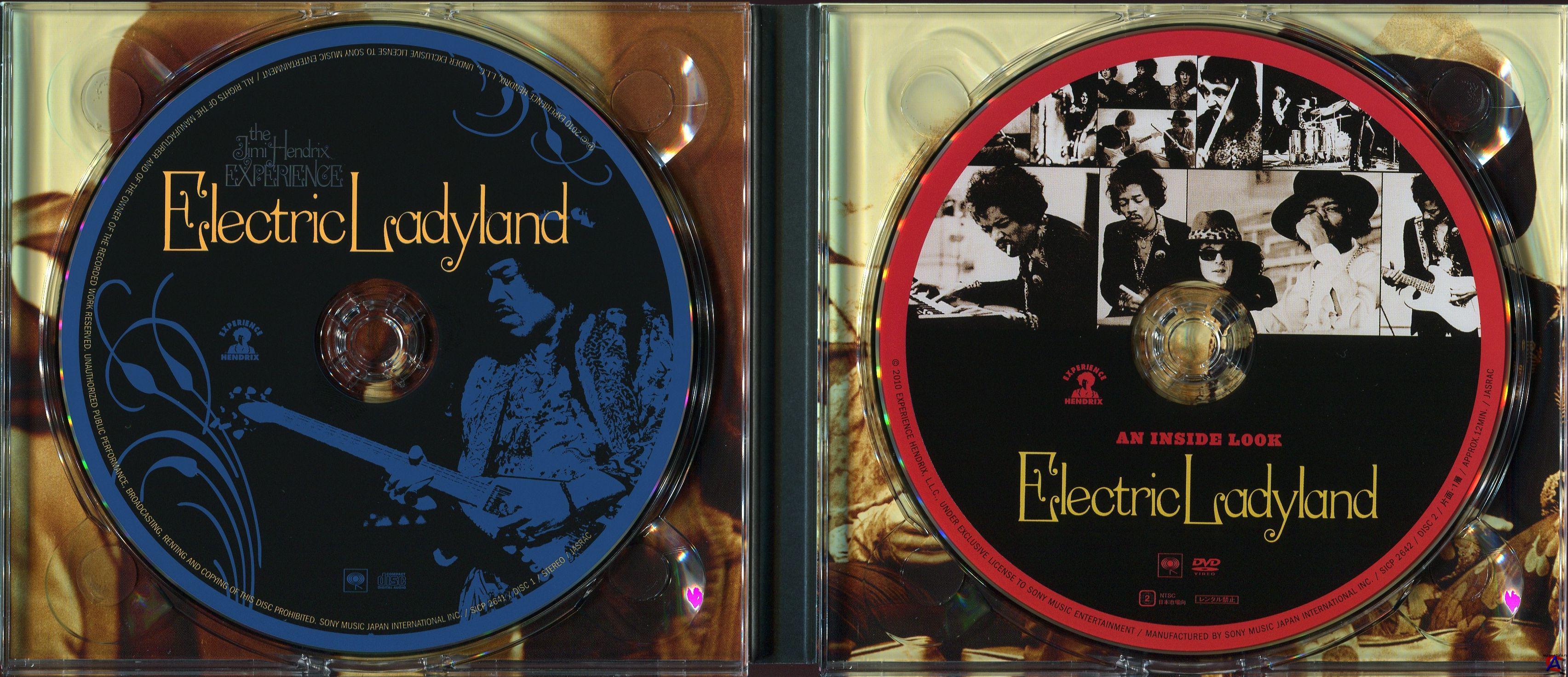 ОБЛОЖКА Electric Ladyland вышел сначала в США в сентябре 1968 и возглавил американские чарты, став первым для Хендрикса альбомом №1. Хендрикс четко описал компании Reprise, какой он хотел видеть обложку: с цветным фото, сделанным Линдой Истман (будущей женой Пола Маккартни), где музыканты The Jimi Hendrix Experience сидят с детьми на статуе Алисы в Стране Чудес в Центральном Парке Нью-Йорка. Это фото в уменьшенном виде и черно-белом варианте можно увидеть с левого края на внутреннем развороте американского конверта. Однако компания-издатель почему-то проигнорировала желание автора и выбрала на обложку фотографию Хендрикса, сделанную Карлом Феррисом. Еще более вольно обошлась с Хендриксом Track Records, выпустившая альбом в Соединенном Королевстве, которая поместила на обложке 19 голых женщин, сидящих на темном фоне с конвертами пластинок Хендрикса в руках. В фильме The Boat That Rocked (Рок-волна) есть эпизод — явная аллюзия на эту обложку (когда радиодиджей Марк сидит в трюме с толпой голых женщин). Любопытно, что произошел казус даже с названием альбома. Какой-то студийный техник перепутал слова, подписал альбом Electric Landlady, и он едва не пошел в печать под этим именем, если б ошибку не заметил вовремя сам Хендрикс, что окончательно вывело его из себя. Это название, кстати — Electric Landlady (Электрическая домовладелица) — позже использовала для своего альбома певица Кирсти Макколл. Как часто издавались двойные альбомы, 1-ая сторона Electric Ladyland совмещена на одной пластинке с четвертой, а вторая — с третьей. Это называлось "автоспаривание" и было расчитано на последовательное проигрывание пластинок в автоматических виниловых чейнджерах. Позже издатели альбома на CD ошибочно записывали после первой стороны четвертую и так далее.