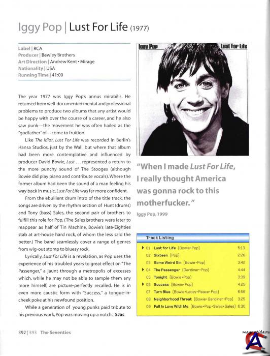 Подробнее Производство Репетиции для «Lust for Life» начались сразу же после окончания концертного тура в поддержку альбома The Idiot, который завершился 16 апреля 1977 года. Поп заявил, что: «Дэвид и я решили, что мы запишем этот альбом очень быстро, мы сочинили, записали, и смикшировали его за восемь дней. Мы сделали это так быстро потому, что у нас было много денег, оставленных заранее, перед нашим расставанием». Певец мало спал во время записи пластинки, комментируя «Слушайте, Боуи чертовски быстрый парень… Я понял, что я должен быть быстрее чем он, иначе чьим альбомом это должно было стать?». Непосредственный лирический метод Попа вдохновил Боуи импровизировать на его собственных текстах, при создании своего следующего альбома, «Heroes». Боуи, Поп и звукоинженер Колин Терстон продюсировали Lust for Life под псевдонимом «Bewlay Bros.» (название заключительный песни на альбоме Боуи Hunky Dory). Запись была сделана на студии Hansa Studio by the Wall, в Берлине, вместе с Рикки Гардинером и Карлосом Аломаром на гитарах и Хантом и Тони Сэйлсами, на барабанах и басу соответственно. Помимо Боуи (который играл на клавишных и исполнил бэк-вокал), среди сессионных музыкантов были три четверти будущего состава его группы Tin Machine. Братья Сэйлс внесли «ураганный вклад» в запись альбома, что побудило Боуи предложить им присоединиться к своей новой группой двенадцать лет спустя («я нашел нам ритм-секцию!» — сказал Боуи гитаристу Ривзу Гэбрелсу, слушая альбом «Lust For Life»). Фотография обложки была снята Энди Кентом, который ранее сделал снимок для обложки альбома The Idiot.