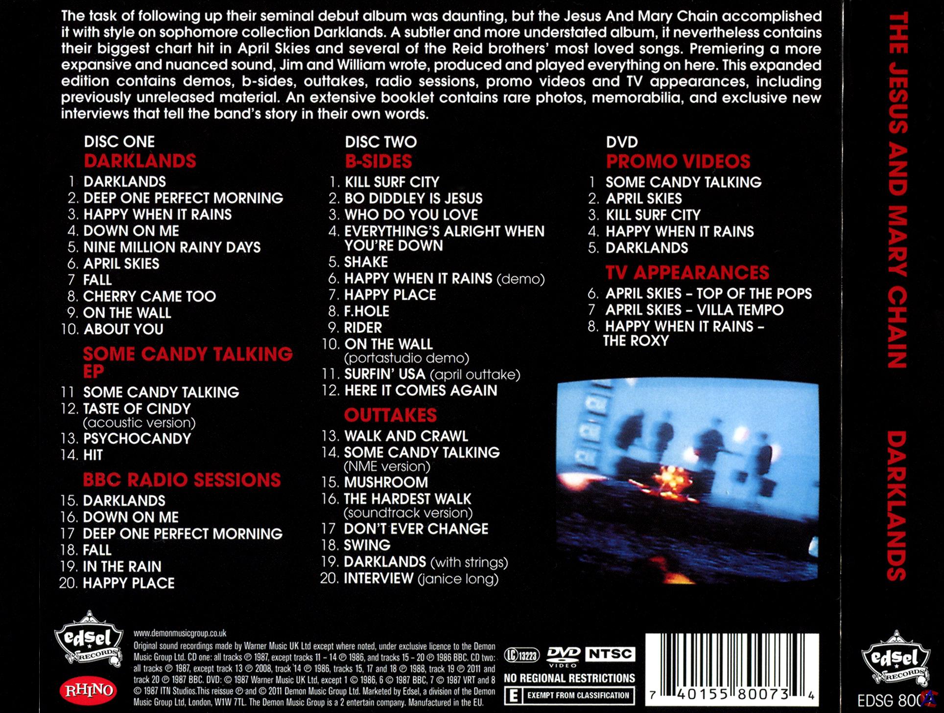 Тржклист CD1 Darklands 1-1 Darklands 5:30 1-2 Deep One Perfect Morning 2:44 1-3 Happy When It Rains 3:37 1-4 Down On Me 2:37 1-5 Nine Million Rainy Days 4:31 1-6 April Skies 4:00 1-7 Fall 2:31 1-8 Cherry Came Too 3:06 1-9 On The Wall 5:05 1-10 About You 2:35 Some Candy Talking EP 1-11 Some Candy Talking 3:18 1-12 Taste Of Cindy (Acoustic Version) 2:00 1-13 Psychocandy 2:54 1-14 Hit 3:29 BBC Radio Sessions 1-15 Darklands 4:40 1-16 Down On Me 2:29 1-17 Deep One Perfect Morning 2:37 1-18 Fall 3:11 1-19 In The Rain 2:28 1-20 Happy Place 2:24