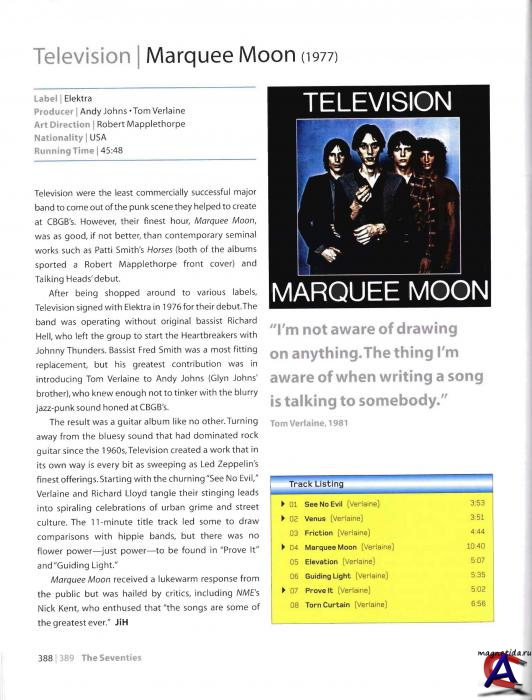 Подробнее Television — американская рок-группа, одни из первопроходцев новой волны и панк-рока. Несмотря на то, что Television не удалось добиться какого-либо мейнстримового успеха, они оказали значительное влияние на нью-йоркскую и мировую рок-сцену. Television были частью ранней панк-сцены Нью-Йорка, связанной с клубом CBGB, наряду с такими исполнителями, как Патти Смит, Suicide, Ramones. Однако, в отличие от намеренного минимализма Ramones, для Television были характерны более изощрённые музыкальные структуры — «дуэлирующие» гитарные партии Верлена и Ллойда, иногда длинные и сложно построенные песни. Благодаря этому Television оказали немалое влияние на новую волну и постпанк, а также стали одной из первых групп так называемого арт-панка. Первоначальной причиной для создания Television стала дружба учившихся вместе Тома Верлена и Ричарда Хэлла; после переезда в Нью-Йорк они основали группу The Neon Boys, которая была переименована в Television после прихода к ним Ричарда Ллойда. Вскоре Television предложили Хилли Кристалу, директору клуба CBGB, в то время специализировавшемуся на блюзе и блюграссе, дать им возможность выступать там на постоянной основе. Благодаря этому Television стали первой выступающей там группой, тем самым положив начало обширной панк-роковой сцене CBGB второй половины 70-х. Постепенно их выступления стали привлекать значительное внимание — в частности, на них обратила внимание Патти Смит, начавшая встречаться с Верленом и благодаря этому решившая попробовать себя в музыке. Первоначально написание песен в группе было примерно поровну разделено между Верленом и Хэллом (изредка в качестве соавтора выступал Ллойд). Однако постепенно Верлен стал пытаться стать полноценным лидером группы, говорил Хэллу «не мешаться под ногами» и постепенно сокращал долю песен Хэлла в концертных выступлениях; в конце концов Хэлл стал исполнять лишь одну «Blank Generation», пока Верлен не решил запретить и её исполнение. (Концертную запись «Blank Generation» в версии Television можно найти на сборнике Хэлла «Spurts» — это одна из немногих сохранившихся записей Хэлла с Television). В итоге Ричард Хэлл решил бросить группу и вошёл The Heartbreakers с покинувшими в то же время New York Dolls Джонни Сандерсом и Джерри Ноланом, а позже основал собственную группу Richard Hell & The Voidoids. Новым басистом Television стал ушедший из Blondie Фред Смит. Первой выпущенной Television пластинкой стал сингл «Little Johnny Jewel», вышедший в 1975 году на независимом лейбле Ork Records. Песня состояла из двух частей, каждая из которых заняла по стороне пластинки. Ллойд был крайне недоволен выбором песни для дебюта (он отдавал предпочтение до сих пор не выпущенной песне «O Mi Amore») и всерьёз думал об уходе из группы; Питер Лаутер, гитарист Pere Ubu, даже проходил прослушивание у Television. Тем не менее, в итоге Ллойд остался в группе. В 1977 году вышел дебютный лонглпей группы — «Marquee Moon», и, несмотря на скромные продажи, получил очень хорошую критику. Так, критик Рой Таркин написал для SoHo Weekly следующий отзыв: «забудьте всё, что вы слышали о Television, забудьте панк, забудьте Нью-Йорк, забудьте CBGB… чёрт, забудьте о рок-н-ролле — это что-то совершенно новое». Альбом продолжаниет считаться главным произведением группы: так, в 2000 году он попал на 83 место в списке музыкального канала VH1 «100 величайших альбомов рок-н-ролла», а в 2003 году — на 123 место в списке 500 величайших альбомов по версии журнала Rolling Stone. Кроме то