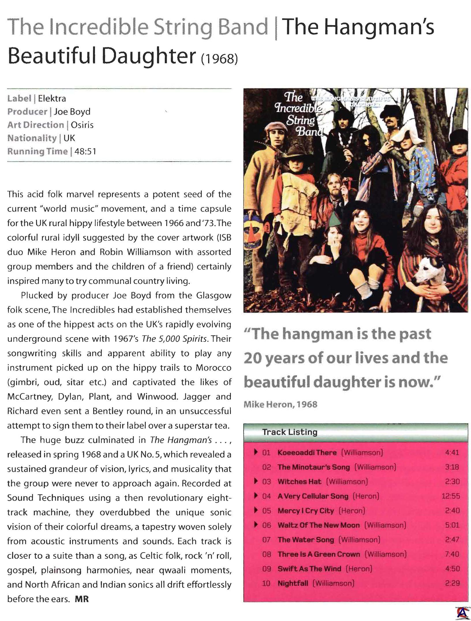 Подробнее История группы История ISB уходит корнями в 1963 год, когда акустический фолк/блюграсс-дуэт Робин Уильямсон — Клайв Палмер начал выступать в эдинбургском клубе «Crown Bar» (завсегдатаем которого был в то время и Берт Джанш). В августе 1965 года их впервые услышал Джо Бойд, тогда еще лишь искавший таланты для влиятельного лейбла Electra Records, специализировавшегося на фолк-музыке. Когда к дуэту в качестве ритм-гитариста присоединился Майк Херон (англ. Mike Heron), появилось и название: The Incredible String Band. В 1966 году группа стала постоянно выступать в ночном фолк-клубе Clive’s Incredible Folk Club в Глазго. Тем временем Бойд был назначен главой лондонского отделения Elесtra Records. Получив от ISB демо-пленку (в основном, блюграсс-стандарты и несколько собственных композиций), он немедленно подписал с ними контракт, опередив конкурентов из Transatlantic Records. Первый альбом группы, The Incredible String Band, записанный в студии Sound Techniques в мае 1966 года, в ежегодном опросе Melody Maker был признан лучшим фолк-альбомом года. Боб Дилан в интервью журналу Sing Out! называл «October Song» своей любимой вещью тех времён. Вскоре после завершения работы над первым альбомом трио распалось: Палмер в составе хиппиозной коммуны отправился в Индию и Афганистан, Уильямсон с подругой Ликорис Маккейни улетел в Марокко. Херон, оставшись в Эдинбурге, вошел в состав Rock Bottom. Вскоре Уильямсон вернулся (без денег, но со множеством марокканских инструментов), Херон присоединился к нему, и реформированные (пока в качестве дуэта) ISB в ноябре 1966 года провели турне по Великобритании, сопровождая известных фолк-исполнителей Тома Пакстона и Джуди Коллинз. Бойд, ставший к этому времени менеджером и продюсером группы, договорился о её участии в Ньюпортском фолк-фестивале. Группа выступила здесь на одной сцене с Джони Митчелл и Леонардом Коэном. В июле 1967 года — при участии Дэнни Томпсона (Pentangle, на контрабасе) и Ликорис (вокал, перкуссия) — ISB записали второй альбом The 5000 Spirits or the Layers of the Onion. Пластинка, в которой были использованы восточные и африканские инструменты, оказалась близкой по духу к психоделическому року, не в последнюю очередь благодаря утонченным, причудливым текстам. Своеобразные творческие отношения сложились и внутри коллектива. Майк и Робин не были друзьями: они всегда общались друг с другом через Майка. Лишившись этого буфера, они преисполнились друг к другу неприязнью. К счастью, авторский вклад их был совершенно равнозначен — как в качественном, так и в количественном отношении. Но едва только один предлагал свою песню, как другой тут же ставил условие: она будет включена в репертуар в том случае, если он, второй, аранжирует инструменты и вокальную гармонию.