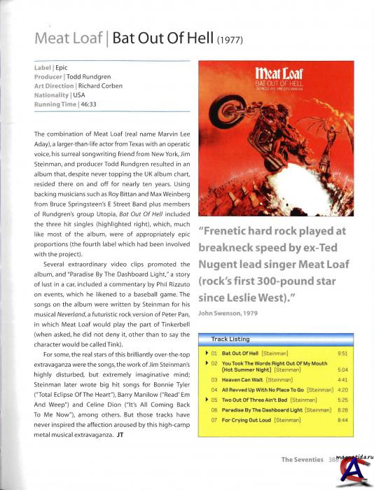 Подробнее ПРЕДЫСТОРИЯ Мит Лоуф и Стейнман начали Bat out of Hell еще в 1972, но не относились к этой работе всерьез до 1974-го, когда Мит Лоуф задумал оставить актерскую карьеру и сконцентрироваться на музыкальной. Они работали над созданием мьюзикла Neverland по мотивам сказок про Питера Пена и заметили, что три песни как-то выделяются из мьюзикла. Это были песни "Bat Out of Hell", "Heaven Can Wait" и "The Formation of the Pack", которую позже переименовали в "All Revved Up With No Place to Go." Тогда решили записать их на отдельный альбом, состоящий из семи песен. Долгое время они не могли найти компанию, которая согласилась бы выпустить этот альбом, поскольку песни не вписывались тогда ни в один из привычных для музыкального бизнеса стилей. Согласно Мит Лоуфу, их прослушивали в разных компаниях, почти весь 1975-ый, 76-ой и 77-ой год и везде отказывали. Обычно они демонстрировали альбом вживую, Стейнман на фортепьяно, Мит Лоуф пел, иногда в песне "Paradise" к ним присоединялась певица и актриса Эллен Фоули (Ellen Foley). Менеджер Мит Лоуфа Соненберг, вспоминая, шутил, что они умудрялись сами так настроить прослушивающих, что те отказывали им. Стейнман говорит, "бывали такие жестокие отказы, какие только можно себе представить". Мит Лоуф говорит, "чуть не свихнулся", после отказа менеджера CBS Клайва Дэвиса. Дэвис не только заявил, что "актеры не пишут пластинки", но и выразил сомнение в способности Стейнмана писать рок-музыку: "Вы знаете, как писать песни? Вы знаете ХОТЬ ЧТО-НИБУДЬ, о том как писать песни? Если вы пишете песню, в ней должны быть A, B, C, B, C, C. А вы что сочинили? А у вас A, D, F, G, B, D, C. Вы представления не имеете, как писать песни... Вы когда-нибудь слушали поп-музыку? Вы когда-нибудь слушали рок-н-ролл?... Вам надо спуститься по лестнице, выйдя от нас... и купить себе послушать несколько рок-н-ролльных пластинок." Мит Лоуф комментирует его слова: "Джим в то время знал каждую пластинку, какие только выходили. Он был ходячей рок-энциклопедией." Покидая офис CBS, Стейнман смеялся над этими обвинениями, а Мит Лоуф крикнул, подняв голову наверх: "Fuck you, Clive!" В конце концов, альбомом решил заняться Тодд Рундгрен (Todd Rundgren), американский музыкант, певец, композитор и продюссер, который нашел альбом довольно забавным. Он сказал: "Я должен сделать этот альбом — он просто "улетный". Впоследствии, в одном интервью 1989 года, Стейнман назвал Рундгрена "единственным гением из гениев из всех, с кем мне приходилось работать." Им, правда, пришлось Рундгрена немного обмануть: они сказали, что уже подписали контракт на альбом с RCA Victor.