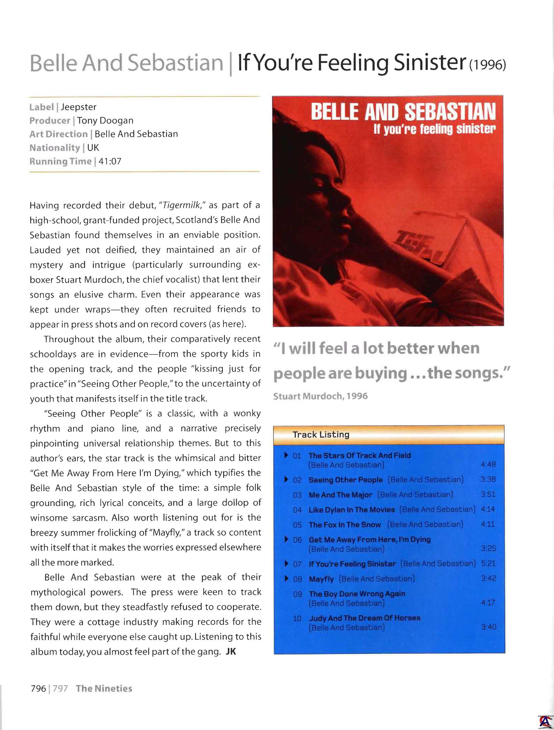 Подробнее If You’re Feeling Sinister известен как один из наиболее признанных альбомов 90-х. Pitchfork Media разместили альбом на 14-м месте в их топе-100 альбомов 1990-х. Журнал Rolling Stone включил альбом в список «Essential Recordings of the 1990s», а журнал Spin разместил альбом на 76-м месте в списке «100 Greatest Albums, 1985—2005». If You’re Feeling Sinister также упоминается в книге 1001 Albums You Must Hear Before You Die в качестве избранного музыкальными критиками. Ещё один источник, анализирующий критику, Acclaimed Music, называет If You’re Feeling Sinister третьим лучшим альбомом 1996 года и 224-м — всех времён. В 2007 году в рамках серии 33S Скотт Плагенхоф написал книгу об альбоме. Группа Belle & Sebastian начала свое существование в 1996 году. Она была образована в Глазго Стюартом Мердоком и Стюартом Дэвидом. После того, как к проекту присоединились еще пять музыкантов, коллектив приступил к работе над своим первым альбомом, Tigermilk. Значительная часть представленного на нем материала была написана Мердоком еще до основания группы, во время его пребывания в Лондоне. Музыкантам понадобилось всего лишь три дня, чтобы записать всю пластинку и выпустить ее на виниле тиражом в тысячу копий. Критики высоко оценили эту работу, благодаря которой молодую группу заметила и подписала компания Jeepster Records. Талантливые шотландцы не стали терять времени и вскоре изготовили следующий альбом, If You"re Feeling Sinister, вышедший в том же году. Эксперты похвалили новинку, но ее продажи оставляли желать лучшего. Тем временем Belle & Sebastian уже считались одной из самых многообещающих и оригинальных групп в Великобритании. Почти сразу после этого релиза команда отправилась в небольшое турне по Штатам. В 1997 году музыканты много времени посвятили работе над записью и изданием своих старых песен, вышедших на мини-альбомах Dog On Wheels, Lazy Line Painter Jane, и 3..6..9 Seconds Of Light. Кроме того, они отыграли несколько концертов в Лондоне, чтобы как следует подготовиться к масштабному туру по США. Большая популярность пришла к Belle & Sebastian после присуждения им награды как лучшей начинающей группе на церемонии BRIT Awards в 1998 году. За этим последовал релиз сингла The Boy With The Arab Strap, дебютировавшего с двенадцатого места в национальных чартах. Выдохшись после активного начала своей карьеры, музыканты охладили свой пыл в 1999 году, который запомнился только одним большим событием в жизни группы. Это был фестиваль Bowlie Weekender, организаторами которого стали сами Belle & Sebastian. На нем группе представилась возможность выступить перед большой аудиторией вместе с рядом известных коллективов. В 2000 году шотландцы выпустили первый альбом, который вошел в десятку лучших в Великобритании, Fold Your Hands Child, You Walk Like A Peasant. Пластинка очень полюбилась британцам, как и вышедший в том же году сингл Legal Man. Это не воодушевило одного из основателей группы, Стюарта Дэвида, который решил оставить шоу-бизнес и заняться писательством. Belle & Sebastian начали 2001 год изданием двух синглов, ставших международными хитами, Jonathan David и I"m Waking Up To Us, а затем наведались с концертами в Японию, Бразилию и США. Они продолжили активно гастролировать и в следующем году, выступив в Дании, Швеции, Голландии, Норвегии, Канаде, Германии, Греции и снова США. Даже после того, как группа получила признание во всем мире, о ней было известно крайне немного. Участники коллектива не любили светиться в прессе и не давали больших интервью. Это стало одной из главных причин достаточно скромн