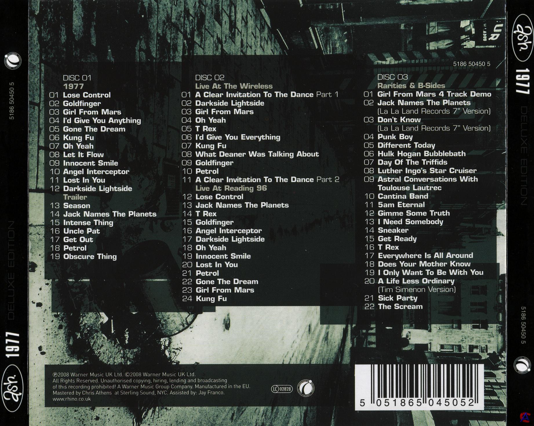 Трэклист CD1 1977 1-01 Lose Control 3:39 1-02 Goldfinger 4:33 1-03 Girl From Mars 3:30 1-04 I"d Give You Anything 4:33 1-05 Gone The Dream 3:31 1-06 Kung Fu 2:19 1-07 Oh Yeah 4:47 1-08 Let It Flow 4:44 1-09 Innocent Smile 5:54 1-10 Angel Interceptor 4:06 1-11 Lost In You 4:21 1-12 Darkside Lightside 5:07 Trailer 1-13 Season 3:02 1-14 Jack Names The Planets 3:12 1-15 Intense Thing 4:36 1-16 Uncle Pat 3:14 1-17 Get Out 1:31 1-18 Petrol 4:25 1-19 Obscure Thing 4:23