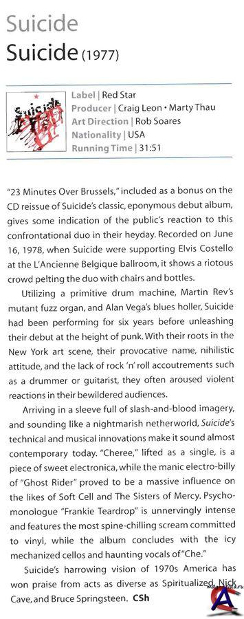 Подробнее С самого начала существования группа избрала своеобразный, в то время мало на кого похожий стиль: простые, но эффектные клавишные риффы Рева (до знакомства с синтезатором он использовал орган Farfisa), примитивный бит драм-машин сочетались с вокалом Веги, который первоначально пытался походить на исполнителей рокабилли, но затем нашёл свой особенный стиль — его то глухой, то пронзительный, нервный вокал можно назвать уникальным. На ранней панк-сцене Нью-Йорка Suicide прославились своими экстравагантными концертными выступлениями. Пример этого можно найти на переиздании дебютного альбома группы, где выпущена композиция «23 Minutes Over Brussels» — запись концерта группы, завершившегося беспорядками. Алан Вега был известен тем, что на сцене размахивал фрагментом мотоциклетной цепи, открыто оскорблял публику и провоцировал с ней драки. Роль визуального элемента, желание добиться конфронтации со зрителем было почерпнуто Вегой при посещении им концерта The Stooges в начале 70-х, который произвёл на него огромное впечатление. Алан Вега признавался, что впервые употребил слово «punk» в 1972-м году. Первый одноимённый альбом группы, Suicide, вышел в 1977 году и приобрёл культовый статус. На альбом вошли эффектные вещи «Ghost Rider», «Cheree» и «Rocket USA», однако наиболее значительной вещью с него стала десятиминутная «Frankie Teardrop», рассказывающая трагичную историю молодого парня, который убил свою молодую жену с грудным ребенком из-за невозможности прокормить их. Критик Эмерсон Дэмерон написал, что эта песня — «одна из самых ужасных, гипнотизирующих, абсурдных вещей, которую я когда-либо слышал». Записи и перформансы Suicide конца 70-х — начала 80-х оказали огромное влияние на постпанк, электро-поп и танцевальную музыку. В числе групп и исполнителей, на которых, по их словам, Suicide оказали значительное влияние, — The Sisters of Mercy, Генри Роллинз, Joy Division, She Wants Revenge, New Order, Soft Cell, Radiohead, The Fleshtones, R.E.M., Рик Окэйзик из The Cars. Фанатом Suicide был Брюс Спрингстин, исполнявший их песни на концертах, а также записавший написанную под влиянием Suicide песню «State Trooper» с альбома «Nebraska». В 1986 году Вега поучаствовал в записи альбома The Sisters of Mercy «Gift» под псевдонимом «The Sisterhood». Вега и Рев долгое время выпускали альбомы сольно, и первым их совместным диском за много лет стал вышедший в 2002 году «American Supreme». Однако продажи диска, стилистически весьма отличавшегося от классических работ Suicide, оказались слабыми, а мнения критики разделились. В 2005 году вышла книга «Suicide No Compromise», биография группы авторства Дэвида Нобакта (англ. David Nobahkt), в которую вошли эксклюзивные интервью с Вегой и Ревом, а также других связанных с группой людей и её известных поклонников. В том же году их песня «Ghost Rider» была использована в бразильской рекламе дезодоранта.