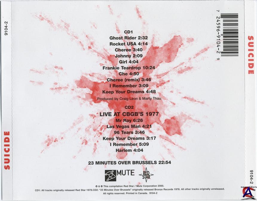 Трэклист CD1 Suicide 1-1 Ghost Rider 2:32 1-2 Rocket USA 4:14 1-3 Cheree 3:40 1-4 Johnny 2:09 1-5 Girl 4:04 1-6 Frankie Teardrop 10:24 1-7 Che 4:50 1-8 Cheree (Remix) 3:46 1-9 I Remember 3:09 1-10 Keep Your Dreams 4:48 CD2 Live At CBGB"s 1977 2-1 Mr Ray 6:26 2-2 Las Vegas Man 4:21 2-3 96 Tears 3:46 2-4 Keep Your Dreams 3:17 2-5 I Remember 5:09 2-6 Harlem 4:04 2-7 23 Minutes Over Brussels 22:54