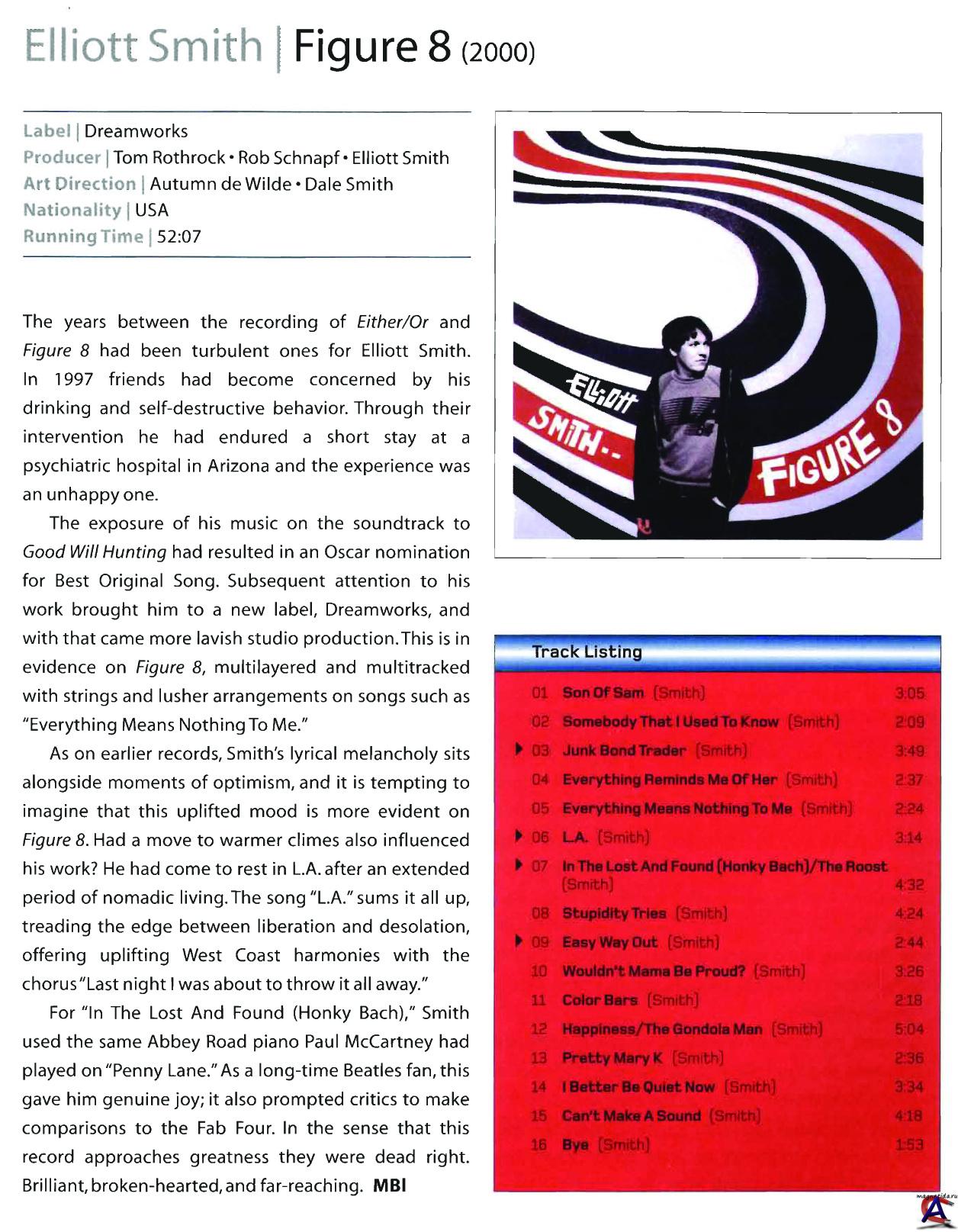 Подробнее После нескольких лет участия в рок-группе Heatmiser Смит начал сольную карьеру, выпустив записи на независимых лейблах Cavity Search и Kill Rock Stars. В 1997 году Эллиот подписал контракт с крупным звукозаписывающим лейблом DreamWorks Records, который выпустил два его альбома (XO и Figure 8). Смит стал известен широкой публике после того, как его песня Miss Misery, написанная для фильма Гаса Ван Сента «Умница Уилл Хантинг», была номинирована на «Оскар» в 1997 году в категории «лучшая песня». На протяжении нескольких лет Смит страдал от хронической депрессии, алкоголизма и наркотической зависимости. Эти темы часто находили отражение в его лирике. Эллиотт умер в возрасте 34 лет от двух ножевых ранений в грудь. Вскрытие не помогло точно установить, были ли ранения нанесены самим музыкантом. Стивен Пол Смит родился 6 августа 1969 года в госпитале Кларксон города Омаха, штат Небраска. Его мать Банни Уэлч (англ. Bunny Welch, в девичестве Bunny Kay Berryman) была преподавателем музыки, а отец, Гэри Смит (англ. Gary Smith) — студентом-медиком Университета Небраски. Спустя год родители Эллиотта развелись. Гэри был призван на службу ВВС и отправлен на Филиппины. Смит с матерью перебрались в пригород Техаса Данканвилль, где в июле 1973 года Банни вышла замуж за Чарли Уэлча (англ. Charlie Welch). Уэлч жестоко обращался с женой и сыном (он рассказал об этом в своем письме Смиту в 1998 году). У Смита были подозрения, что отчим насиловал его, но никаких воспоминайний у него не осталось, а Уэлч полностью отрицал эти обвинения. Смит наглядно отразил этот период своей жизни в тексте песни «Some Song»: "Charlie beat you up week after week, and when you grow up you’re going to be a freak" (рус. Чарли избивает тебя каждую неделю, и когда ты вырастешь, ты станешь полоумным)". На протяжении многих лет имя "Чарли" фигурирует в разных песнях Смита, например «Flowers for Charlie» и «No confidence man», в то время как имена биологических родителей музыканта ни в одной из его песен не упоминаются. Эллиотт окончил Хэмпширский колледж в Амхерсте, штат Массачусетс, в 1991 году с дипломом по философии и политологии. «Думаю, это доказало мне, что я могу заниматься чем-то, чем заниматься не хочу, в течение четырёх лет. Вот только мне как раз нравилось то, что я изучал. Тогда это было что-то вроде "Это твой единственный шанс поступить в колледж, и тебе стоит им воспользоваться, потому что иначе однажды ты можешь об этом пожалеть". К тому же, причиной, по которой я вообще подал документы, была моя девушка, и к тому времени, как мы расстались накануне первого дня учёбы, меня уже приняли». Окончив колледж, Эллиотт работал в булочной в Портленде со степенью бакалавра по философии и правовой теории. В колледже Эллиотт основал музыкальную группу Heatmiser вместе с Нилом Гастом (англ. Neil Gust) (одноклассником из Хэмпшира). Окончив колледж, музыканты (к тому времени Смит, Тони Лэш и Брэндт Питерсон, которого после записи "Mic City Sons" в августе 1994 заменил Сэм Кумс, позже участник группы Quasi) решили профессионально заняться музыкой в Портленде. По звучанию у них было много общего с Fugazi и другими панк-группами. Музыканты записали один альбом и EP, после чего подписали контракт с Virgin Records, чтобы выпустить альбом, ставший их последней работой — Mic City Sons. Смит убедил Virgin, законных обладателей первых трёх сольных альбомов, передать права Cavity Search Records, а затем — Kill Rock Stars, чтобы обеспечить естественное развитие его пока ещё слабо развиваю