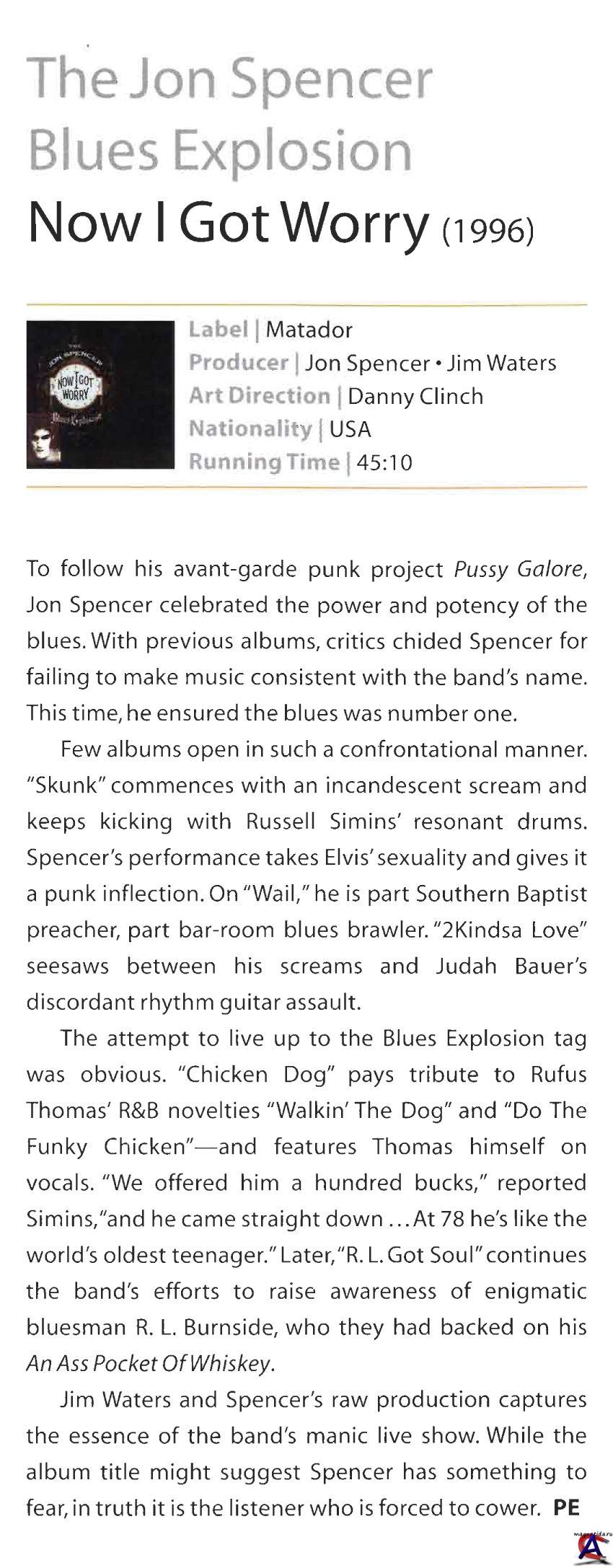 «Аааааоооууууу! — с таким воинственным кличем появляется на сцене Джон Спенсер (Jon Spencer), лид-вокалист и гитарист группы Jon Spencer Blues Explosion, громогласно провозглашая: — Blues Explosion!» Эту фразу он будет выкрикивать еще десятки раз, после каждой из 150 — так кажется зрителям — песен, которые трио успевает прогрохотать за полтора часа. На публику обрушивается 90 минут звукового урагана, «нечто среднее между консервной банкой, прыгающей по эскалатору, и Rolling Stones, пропущенными через стиральную машину». Между тем на сцене всего три человека: в этом шквале повинны две гитары плюс барабаны минус бас. Всего три виртуоза. Они меняют темп, интенсивность, громкость и настроение с потрясающей ловкостью, выдавая на-гора ритмически довольно упорядоченный, мускулистый рок, оголенный, как скелет, и открыто флиртующий с ритм-н-блюзом.