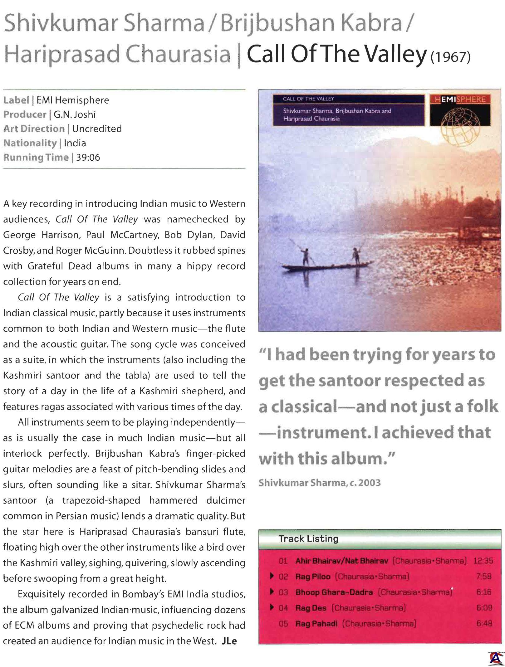 Альбом Харипрасада и Ко 1967 года Call of the Valley был наверное первым успешным индийским проектом на западе и значительно продвинул хинди-культуру в массы (хотя, если вспомним, в 67-ом только ленивый ее не продвигал, но это все же аутентичный проект, а не Ринго с ситаром). Доподлинно известно, что и Ринго, и Пол, и даже такая звезда американской фолк-сцены как Б. Дилан очень взлюбили эту пластинку. Альбом повествует об одном дне из жизни кашмирского пастуха.