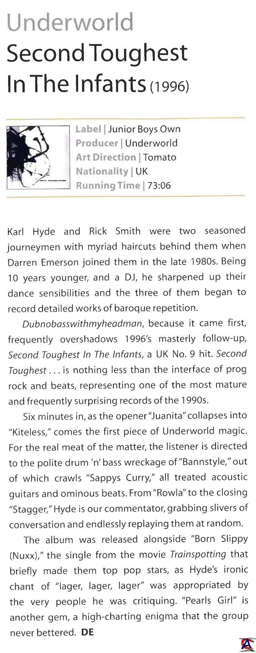 Подробнее Дебютная студийная работа Underworld увидела свет в 1988 году и получила название Underneath The Radar. Интересное звучание и концепция пришлись по вкусу слушателям, а в 1989 году музыканты выпустили второй лонгплей Change The Weather, на котором была представлена знаменитая песня Stand Up. В 1991 году к Карлу и Рику присоединился Даррен Эмерсон, и в 1994 году трио выпустило сильный альбом Dubnobasswithmyheadman, который продемонстрировал изменения в стиле и переход к трансу. Пластинка получила прекрасные отзывы, да и слушатели оценили ее по достоинству. Так, музыканты определились, в каком направлении они будут работать дальше: в 1996 году они выпустили альбом Second Toughest In The Infants, оказавшийся таким же интересным, как и его предшественник. За ним последовал очень успешный лонгплей Beaucoup Fish (1999). Одно музыкальное издание даже назвало Beaucoup Fish «электронным The Dark Side Of The Moon» легендарных Pink Floyd, а такое сравнение многое говорит об уровне пластинки Underworld. Дискография музыкантов пополнилась оригинальной студийной работой A Hundred Days Off в 2002 году. В композициях появились элементы эмбиента и лаунджа, что, безусловно, придало творчеству Underworld новую окраску. Спустя пять лет группа выпустила лонгплей Oblivion With Bells (2007), сохранивший настрой на отдых и, если хотите, релаксацию: нотки эмбиента, представленные на Hundred Days Off, никуда не исчезли. Новый альбом Underworld — Barking увидел свет в 2010 году и получил прекрасные отзывы экспертов, да и ожидания поклонников полностью оправдались. Традиционно сильная работа, Barking придется по вкусу и старым поклонникам коллектива, и всем любителям качественной электронной музыки. Четвёртый альбом группы записывался …в спальне крошечной квартиры Смита. Рик Смит: «Она (комната) была примерно четыре на четыре с половиной метра. Со звукоизоляцией были проблемы. Терпение моей жены было больше, чем океан – месяц за месяцем слушать повторяющиеся биты…» Рик Смит – об оборудовании своей домашней студии того времени: «Пульт был Soundcraft серии S600. Отличный, очень простой. У нас был компьютер Atari 1040 с программой C-Lab Creator – просто динамит, я всё ещё её использую. Звук шёл через пульт, в котором не было цифровой синхронизации, и в этом была своя прелесть, это было здорово. Ещё я использовал 12-дорожечный плёночный магнитофон Akai MG14D, который был синхронизирован с Atari при помощи старого синхронизатора Fostex. Я мог запускать секвенсор и синхронизировать его с плёнкой». Удивительно, как в небольшой спальне Смит смог разместить всё своё оборудование! Смит: «Сэмплирование было очень простым. Был (сэмплер) Casio FZ-1 – я не мог себе позволить Akai S900. Микрофонам всегда уделялось много внимания, был Neumann TLM170, великолепный, мы его используем до сих пор. Ещё у нас был вокодер, (синтезаторы) ARP2600, OSCar, Roland 303, 909 Nord для баса, Yamaha DX7 Mk1, две Yamaha SPX90, Roland MT32 и Roland SD3000» — итого более десятка синтезатров, сэмплеров и ритм-машин, весьма внушительный набор для домашней студии самого начала 1990-х. К сожалению, сразу после записи альбома Смиту пришлось распродать значительную часть этой коллекции: несмотря на успех предыдущего альбома, группа была по уши в долгах. Смит: «Всё записывалось в портативный DAT-рекордер Sony, он работал на батарейках. Не было записи на жёсткий диск, хотя я позже арендовал один (хард-диск рекордер), чтобы свести треки. Вообще-то сведение было очень «живым», всё через пульт, запускались все миди и магнитоф