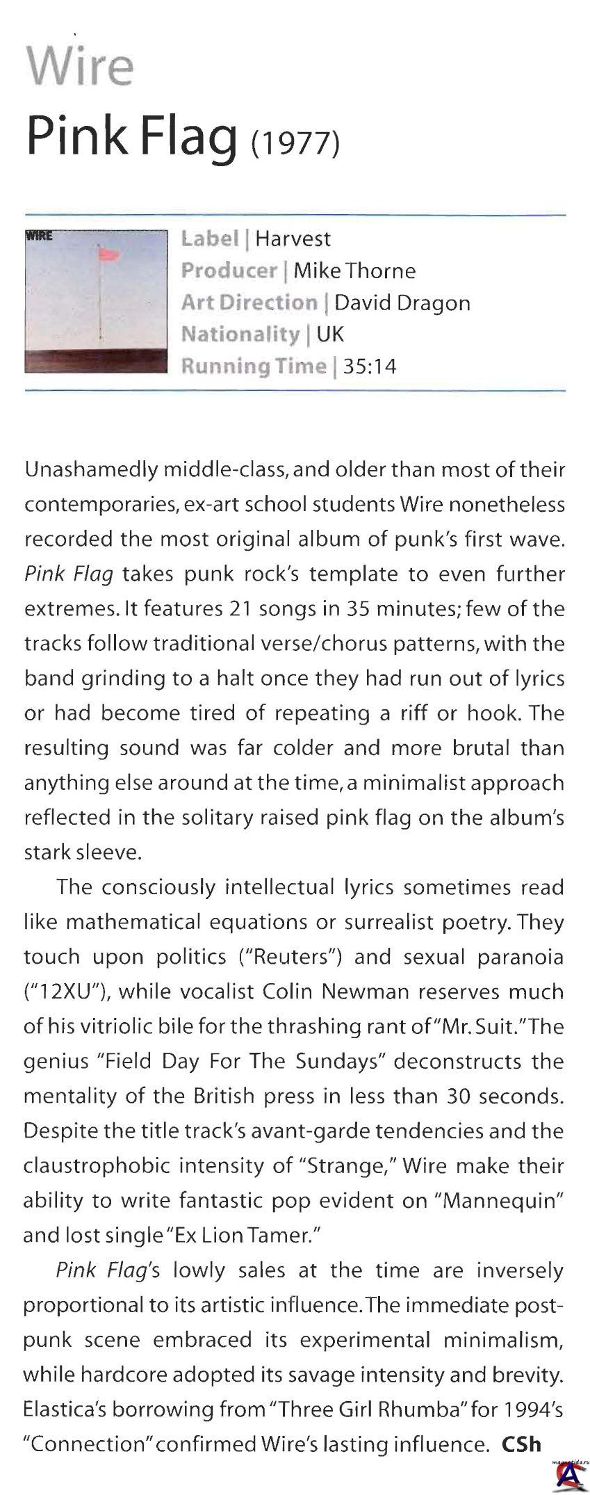Wire — британская рок-группа, образовавшаяся в 1976 году в Уотфорде, Англия, и считающаяся одним из наиболее влиятельных коллективов новой волны. Wire, начинав свой творческий путь на панк-сцене (свидетельство чему — участие в компиляции Live at The Roxy), быстро отдалилась от общего направления, взявшись за создание экспериментальной, не поддающейся прямой категоризации музыки. Пресса отмечала у Wire общие черты с Брайаном Ино, Velvet Underground, Roxy Music, Can и Кэптеном Бифхартом, хотя сами музыканты группы утверждали, что влияниям вообще подвержены не были. Первые три альбома Wire, как отмечали специалисты, сыграли ключевую роль в формировании и становлении пост-панка как отдельной ветви музыкального развития.