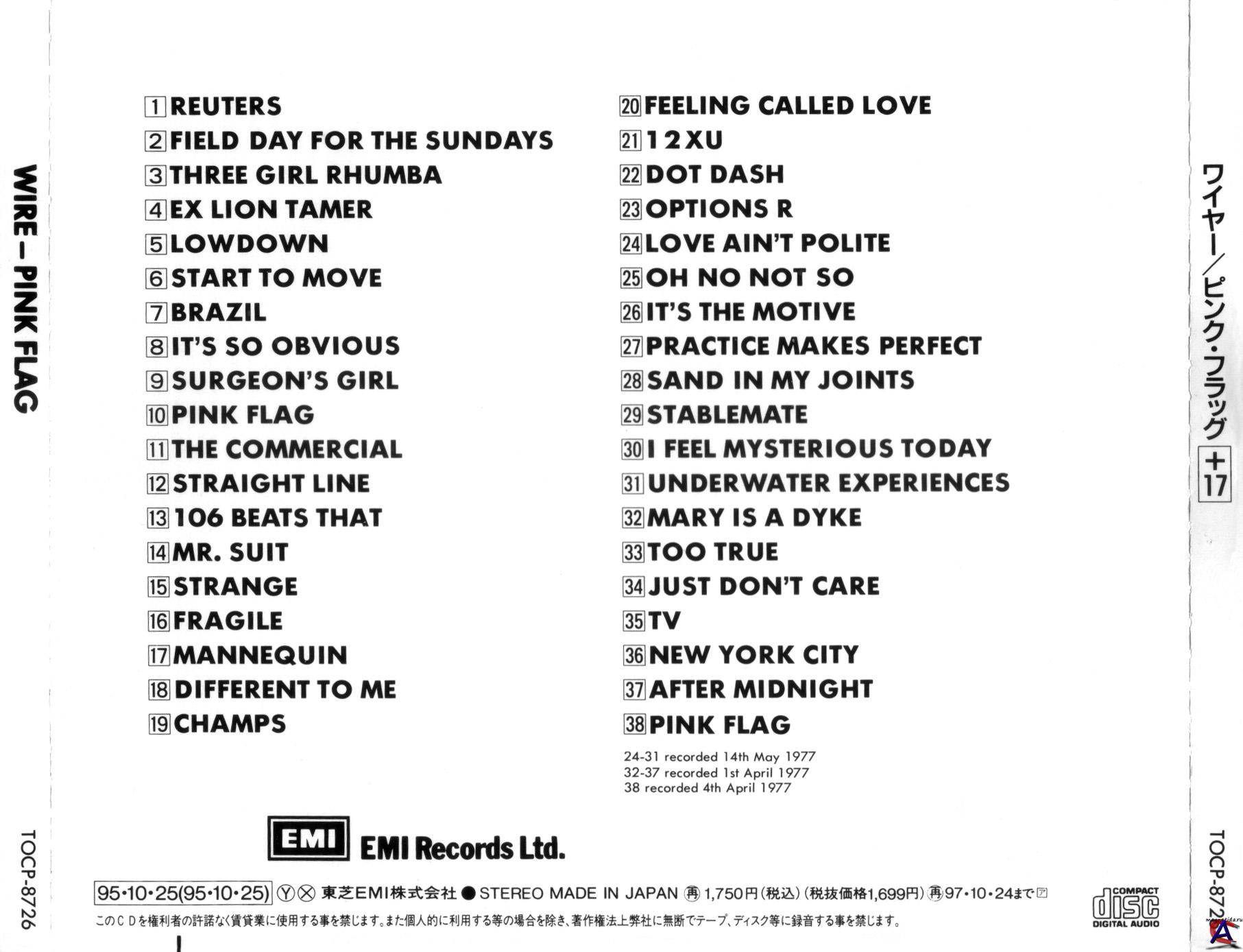 Трэклист 1 Reuters 3:03 2 Field Day For The Sundays 0:28 3 Three Girl Rhumba 1:23 4 Ex Lion Tamer 2:17 5 Lowdown 2:26 6 Start To Move 1:12 7 Brazil 0:40 8 It"s So Obvious 0:53 9 Surgeon"s Girl 1:14 10 Pink Flag 3:50 11 The Commercial 0:49 12 Straight Line 0:44 13 106 Beats That 1:12 14 Mr. Suit 1:25 15 Strange 3:58 16 Fragile 1:18 17 Mannequin 2:37 18 Different To Me 0:43 19 Champs 1:46 20 Feeling Called Love 1:21 21 1 2 X U 1:55 22 Dot Dash 2:25 23 Options R 1:35 24 Love Ain"t Polite 1:07 25 Oh No Not So 1:36 26 It"s The Motive 1:22 27 Practice Makes Perfect 3:48 28 Sand In My Joints 1:49 29 Stablemate 2:16 30 I Feel Mysterious Today 1:40 31 Underwater Experiences 3:15 32 Mary Is A Dyke 1:06 33 Too True 1:05 34 Just Don"t Care 1:22 35 TV 1:25 36 New York City 1:12 37 After Midnight 1:28 38 Pink Flag 2:35