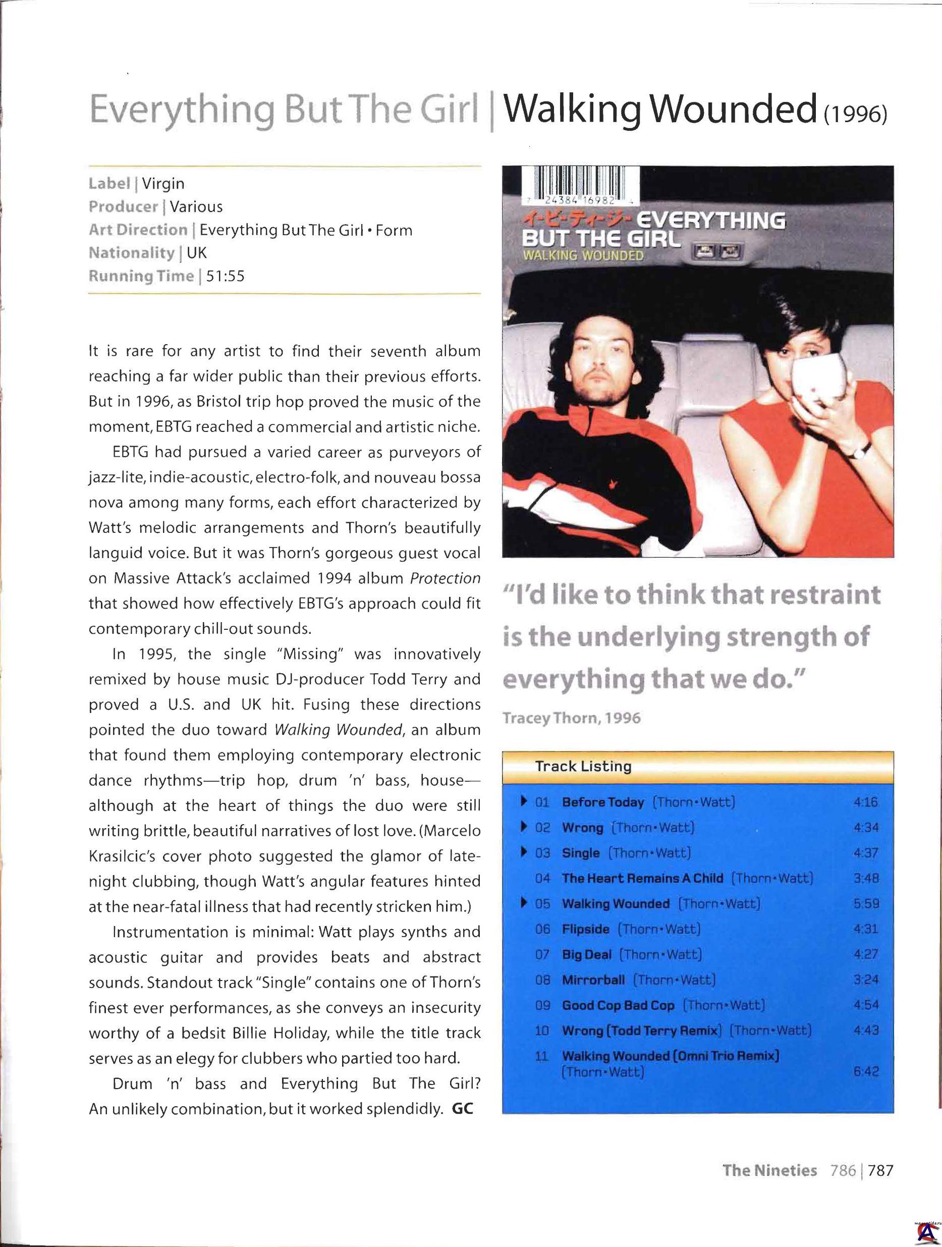 Walking Wounded — девятый студийный альбом Everything but the Girl, выпущенный в 1996-ом году. Он является их наивысшим достижением на сегодняшний день, достигнув № 4 в Великобритании и № 37 в США. После того, как Todd Terry наложил свои руки на вещь EBTG "Missing" и запустил его на орбиту практически всех клубов мира, мужской состав группы (Ben Watt), по-видимому, решил, что хватит заниматься каким-то фолк-джазом, а пора углубиться в электронику, тем более что это так просто и понятно, к тому же под рукой есть яркий запоминающийся вокал, который при любой грустной музыке будет звучать хорошо. Таким образом и родился этот альбом — симбиоз джангла, d"n"b и джазовых вокальных данных Tracy Thorn. Альбом был своеобразным прорывом для группы в конце 20-го века — это замечательное произведение как для прослушивания в спальне, так и в клубе. Все композиции при желании могли бы стать хитами, но вперед вырвались лишь "Before Today" и "Wrong". Впрочем, трудно выделить какие-то отдельные хитовые композиции, т.к. альбом — это целостное меланхоличное в духе EBTG создание, слушащееся одним махом. В записи пластинки принимали участие гуру электроники Howie B и тот же Todd Terry, а также еще целая куча клубных музыкантов. Альбом также содежит два ремикса — Todd Terry ("Wrong") и Omni Trio ("Walking Wounded"), содержащих как бы следующий скачок в творчестве команды.