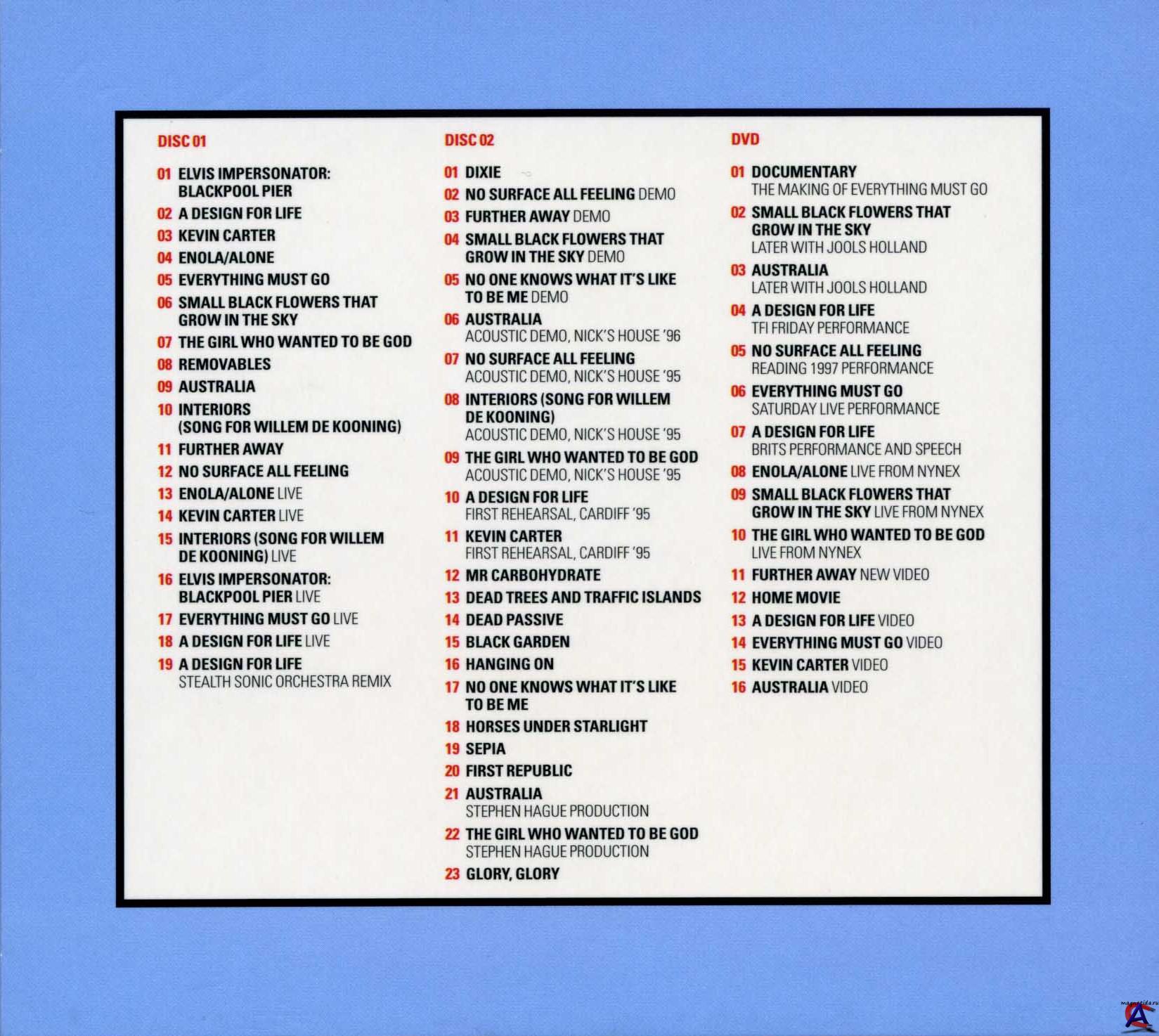 Трэклист CD1 CD1-1 Elvis Impersonator: Blackpool Pier 3:28 CD1-2 A Design For Life 4:17 CD1-3 Kevin Carter 3:25 CD1-4 Enola/Alone 4:08 CD1-5 Everything Must Go 3:40 CD1-6 Small Black Flowers That Grow In The Sky 3:03 CD1-7 The Girl Who Wanted To Be God 3:36 CD1-8 Removables 3:31 CD1-9 Australia 4:04 CD1-10 Interiors (Song For Willem De Kooning) 4:18 CD1-11 Further Away 3:39 CD1-12 No Surface All Feeling 4:21 CD1-13 Enola/Alone (Live) 3:30 CD1-14 Kevin Carter (Live) 3:07 CD1-15 Interiors (Song For Willem De Kooning) (Live) 3:39 CD1-16 Elvis Impersonator: Blackpool Pier (Live) 2:48 CD1-17 Everything Must Go (Live) 3:30 CD1-18 A Design For Life (Live) 4:32 CD1-19 A Design For Life (Stealth Sonic Orchestra Remix) 4:52 CD2 CD2-1 Dixie Written-By – Daniel Emmet 0:42 CD2-2 No Surface All Feeling (Demo) 3:38 CD2-3 Further Away (Demo) 3:32 CD2-4 Small Black Flowers That Grow In The Sky (Demo) 3:04 CD2-5 No One Knows What It"s Like To Be Me (Demo) 2:58 CD2-6 Australia (Acoustic Demo, Nick"s House "96) 4:15 CD2-7 No Surface All Feeling (Acoustic Demo, Nick"s House "95) 4:02 CD2-8 Interiors (Song For Willem De Kooning) (Acoustic Demo, Nick"s House "95) 2:58 CD2-9 The Girl Who Wanted To Be God (Acoustic Demo, Nick"s House "95) 3:59 CD2-10 A Design For Life (First Rehearsal, Cardiff "95) 3:56 CD2-11 Kevin Carter (First Rehearsal, Cardiff "95) 3:22 CD2-12 Mr Carbohydrate 4:15 CD2-13 Dead Trees And Traffic Islands 3:44 CD2-14 Dead Passive 3:19 CD2-15 Black Garden 4:01 CD2-16 Hanging On 3:01 CD2-17 No One Knows What It"s Like To Be Me 3:04 CD2-18 Horses Under Starlight 3:08 CD2-19 Sepia 3:54 CD2-20 First Republic 3:48 CD2-21 Australia 8:08 CD2-22 The Girl Who Wanted To Be God 4:09 CD2-23 Glory, Glory 0:36