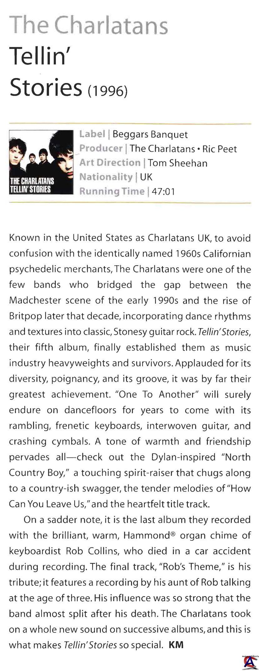 Первоначально в ее состав входили вокалист и гитарист Баз Кеттли (Baz Kettley), клавишник Роб Коллинз (Rob Collins, р. 12 июня 1965), барабанщик Джон Брукс (Jon Brookes) и басист Мартин Блант (Martin Blunt). Ребята играли вместе недолго и вскоре поняли, что им необходим другой вокалист. На организованное прослушивание пришел в числе прочих и Тим Берджес (Tim Burgees, р. 30 мая 1967), который и был принят в группу. Также в состав группы вошел новый гитарист — Джон Бейкер (Jon Baker). THE CHARLATANS основали собственный звукозаписывающий лейбл Dead Dead Good и на нем выпустили свой дебютный сингл Indian Rope. Он разошелся тиражом в 20 тыс. копий практически без ротации на радио, и на группу обратила внимание звукозаписывающая компания Beggars Banquet. На ней был в 1990 выпущен дебютный альбом THE CHARLATANS «Some Friendly», который возглавил британский альбомный чарт. Вскоре был выпущен следующий сингл The Only One I Know, который вошел в лучшую десятку песен Великобритании. Но когда настало время выпуска второго альбома, предварявшие его синглы не снискали большой популярности. Еще до релиза диска группу покинул гитарист Джон Бейкер; на его место пришел Марк Коллинз (Marc Collins). Второй альбом группы «Between 10th & 11th» , вышедший в 1992, не смог повторить успех предыдущего и достиг лишь 12-го места в альбомном чарте. Вскоре клавишник группы Роб Коллинз был осужден на 8 месяцев, поэтому работа над следующим диском проходила в основном без его участия. Третий альбом «Up To Our Hips» увидел свет в начале 1994 и, хотя достиг 10 места в альбомном чарте, был прохладно принят критикой. THE CHARLATANS реабилитировались в 1995, когда следующий альбом, названный так же, как и сама группа, достиг первого места в чарте. В преддверии выпуска следующего диска в автокатастрофе погиб клавишник Роб Коллинз. Несмотря на это, группа заявила, что не собирается прекращать совю деятельность, и в доказательство этому выпустила в 1997 чрезвычайно успешный альбом «Tellin" Stories»; пластинка две недели подряд возглавляла британский альбомный чарт. Альбом предварял сингл One To Another, который стал самым успешным в истории THE CHARLATANS.