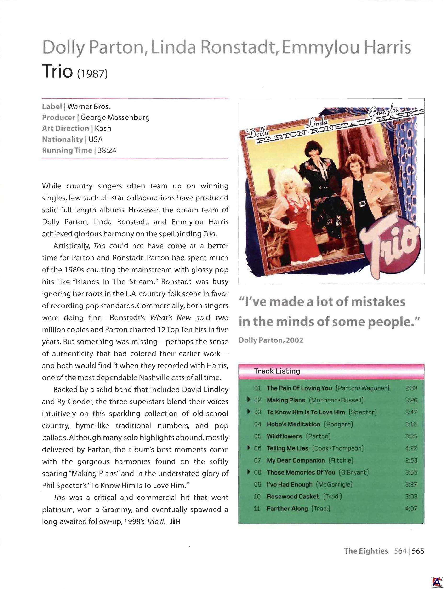 Трио представляет собой совместный альбом трех американских исполнительниц, Dolly Parton, Linda Ronstadt и Emmylou Harris. Альбом, выпущенный в феврале 1987 года, был продан в количестве более 4 миллионов копий по всему миру, а также получил несколько наград, включая две премии Grammy. Parton, Ronstadt and Harris выпустила второй альбом, Trio II, в 1999 году.