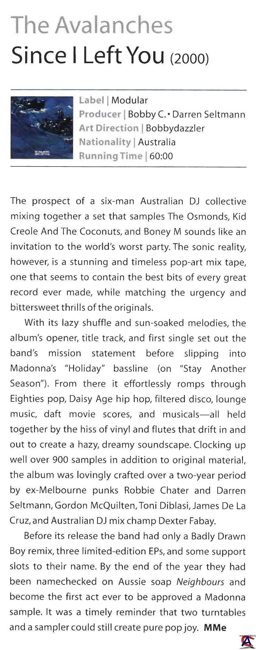 Подробнее В марте 1997 года группа выпускает дебютный сингл “Rock City” на лейбле Trifekta Records. Песня вызывает большой интерес со стороны австралийского лейбла Modular Recordings, с которым очень скоро музыканты подписывают долгосрочный контракт. Группа выпускает макси-сингл “El Producto”, состоящий из семи песен. Группа проводит серию концертов, выступая на разогреве у таких известных команд, как Beastie Boys, Jon Spencer Blues Explosion и Public Enemy. Дебютный альбом Avalanches “Since I Left You” был выпущен на родине в ноябре 2000 года и получил очень хорошие отзывы у критиков и слушателей. Использовав на альбоме большое количество сэмплов и эмбиент-эффектов (типа ревущих лошадей и шума толпы), группа сделала один из лучших психоделических альбомов за последние 40 лет. Популярность команды так быстро росла, что даже Мадонна, изменив традиции, разрешила Avalanches использовать сэмпл из своего раннего хита “Holiday” для не очень этичного трека “Stay Another Season”. “Since I Left You” стал еще более популярным, когда вышел в Великобритании в апреле 2001 года на лейбле XL Records.